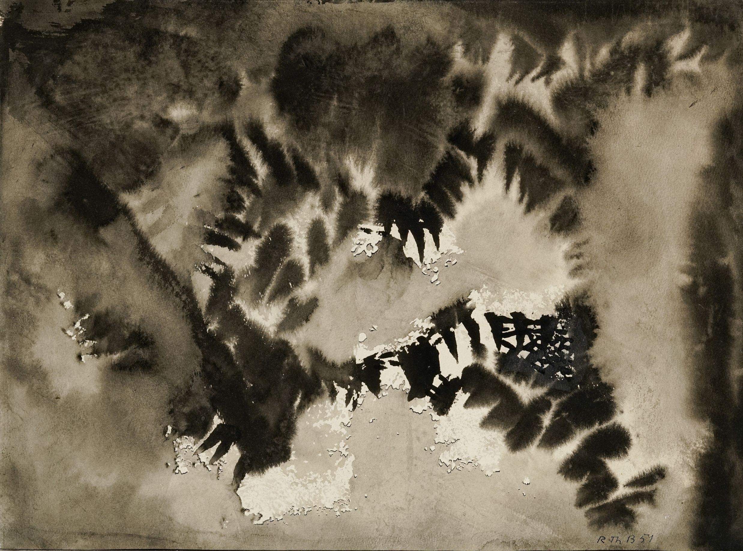Motif abstrait noir et blanc, aquarelle sur papier, monogrammée et datée 54, 37x49 cm
