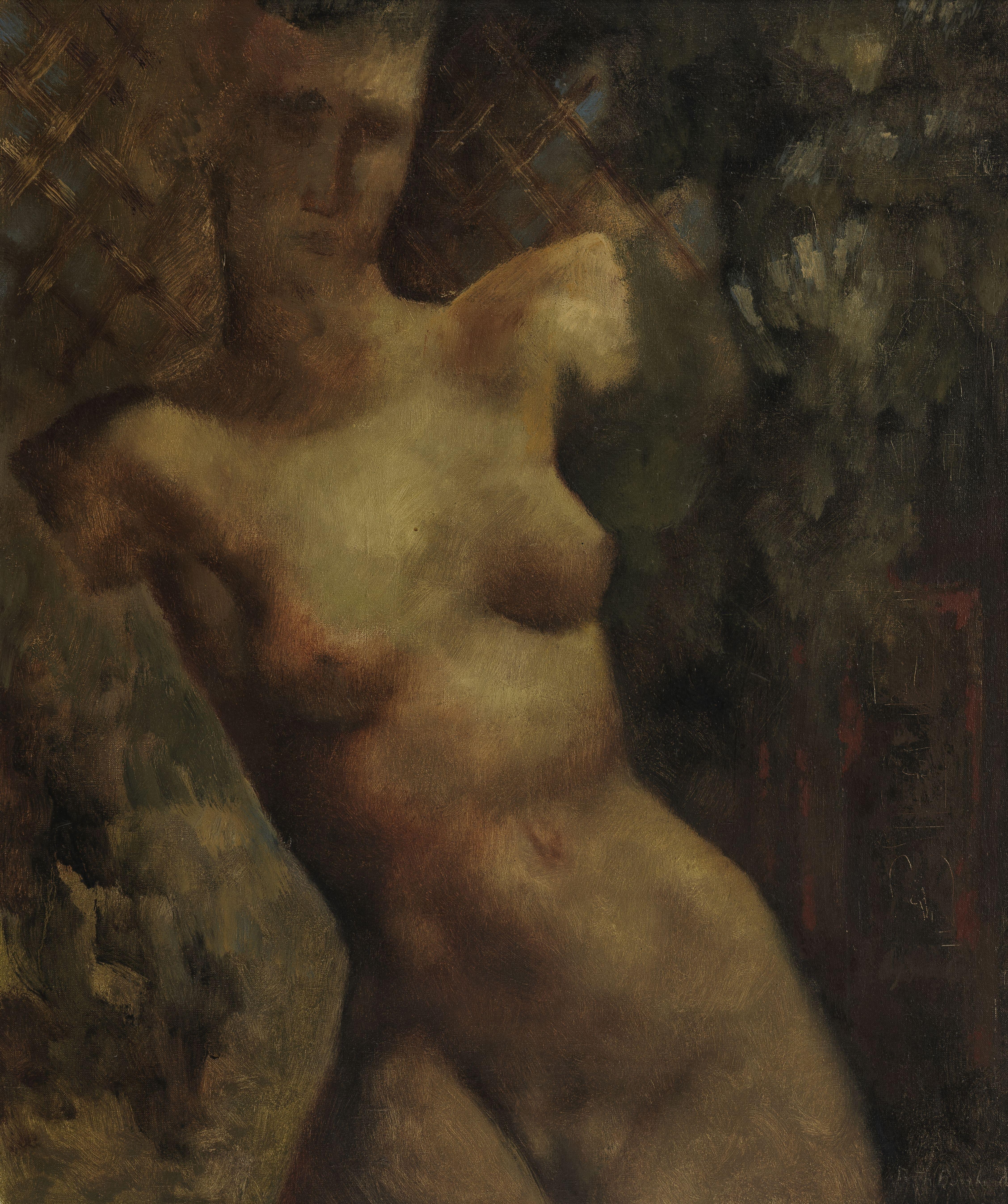 Statue au jardin, huile sur toile, signée et datée 1945, numérotée au dos II/614, 65,5x54 cm. Cette œuvre est accompagnée du certificat de l'Association Rodolphe-Théophile Bosshard en date du 10 février 2020. Il précise que cette toile est répertoriée dans le catalogue raisonné "Bariatinsky" de 1961.