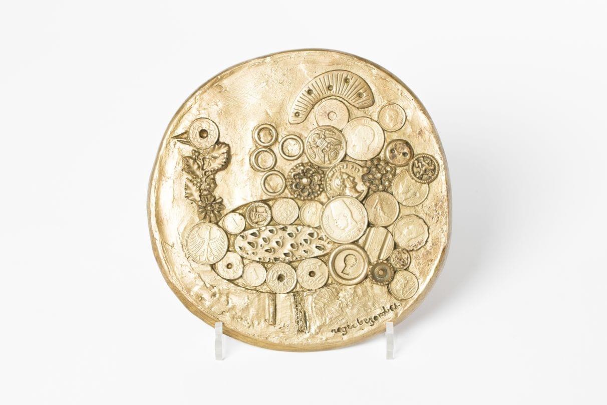 Poule aux œufs d'or, médaillon en bronze à patine dorée, signé, D 21 cm