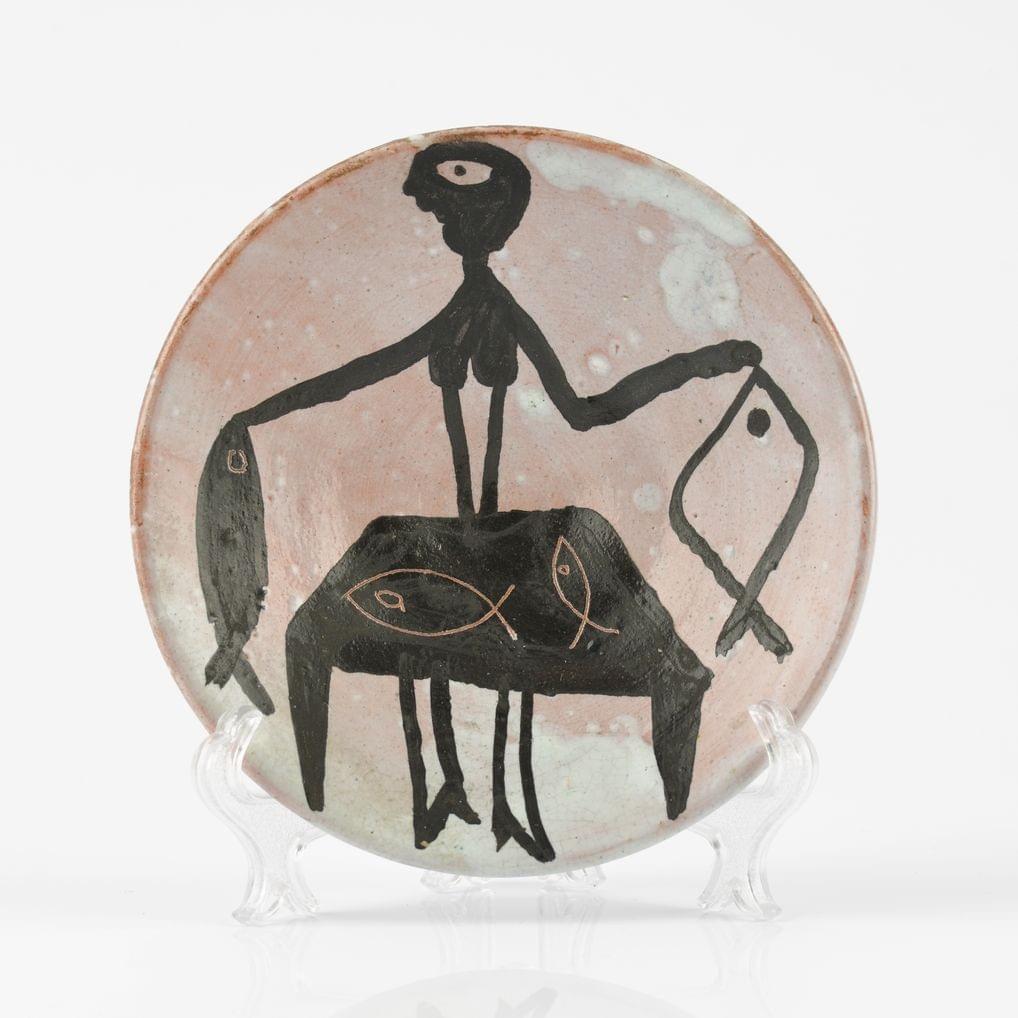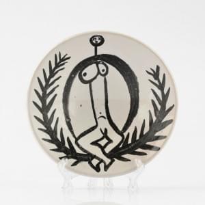 Deux coupelles, céramique émaillée noir et vert à décor de personnages, signées, D 15 et 11 cm