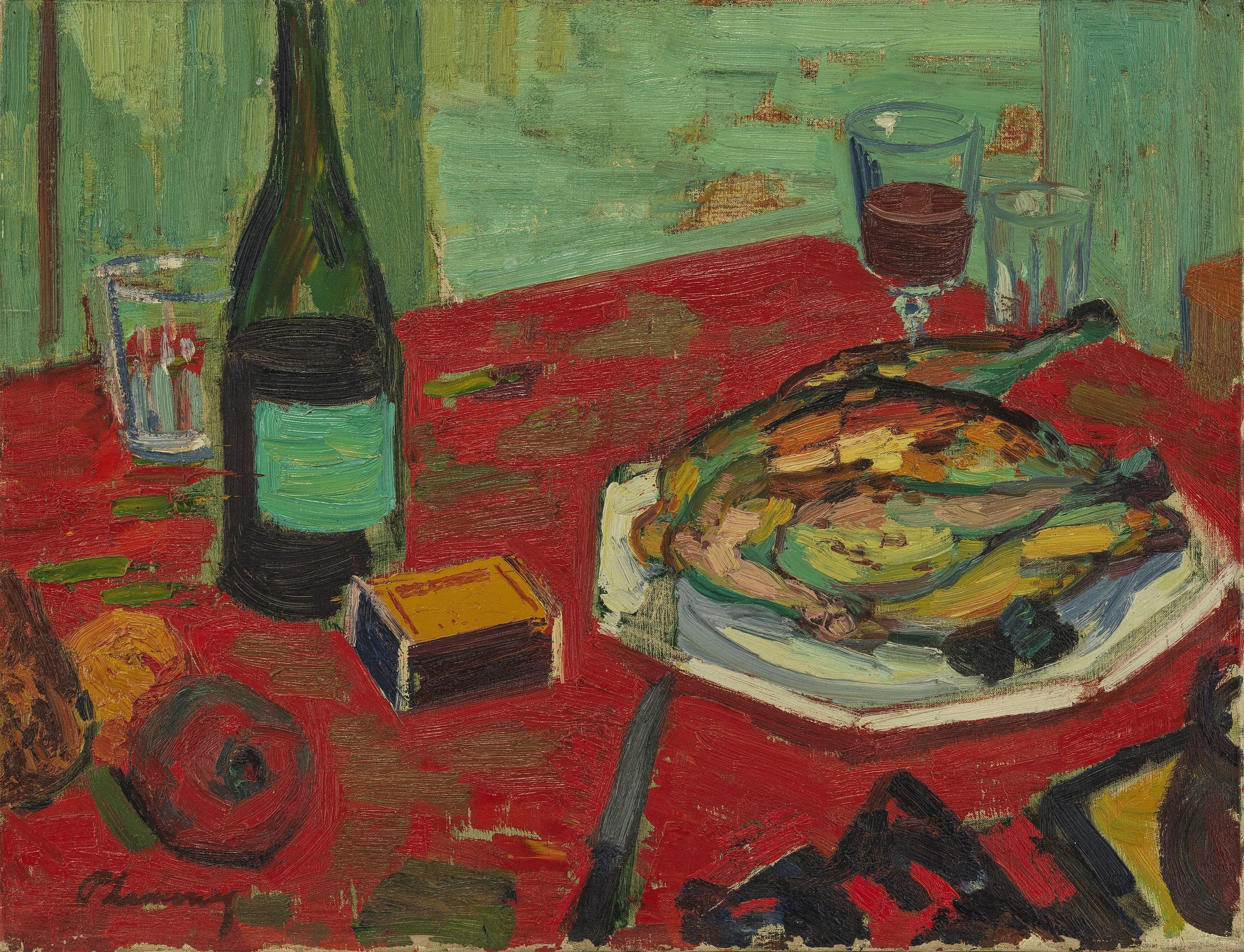 Nature morte à la nappe rouge, huile sur toile, 50x65 cm