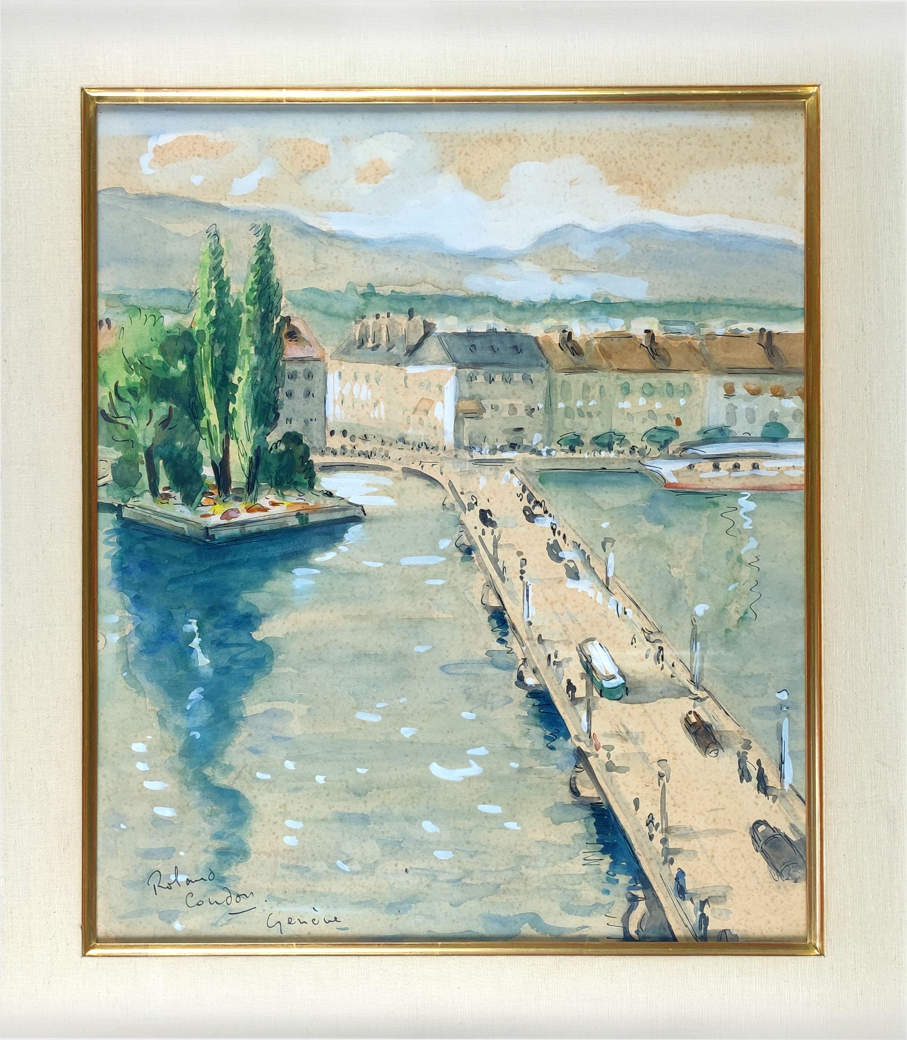 Plongée sur le pont du Mont-Blanc, aquarelle sur papier, signée, 47x40 cm.