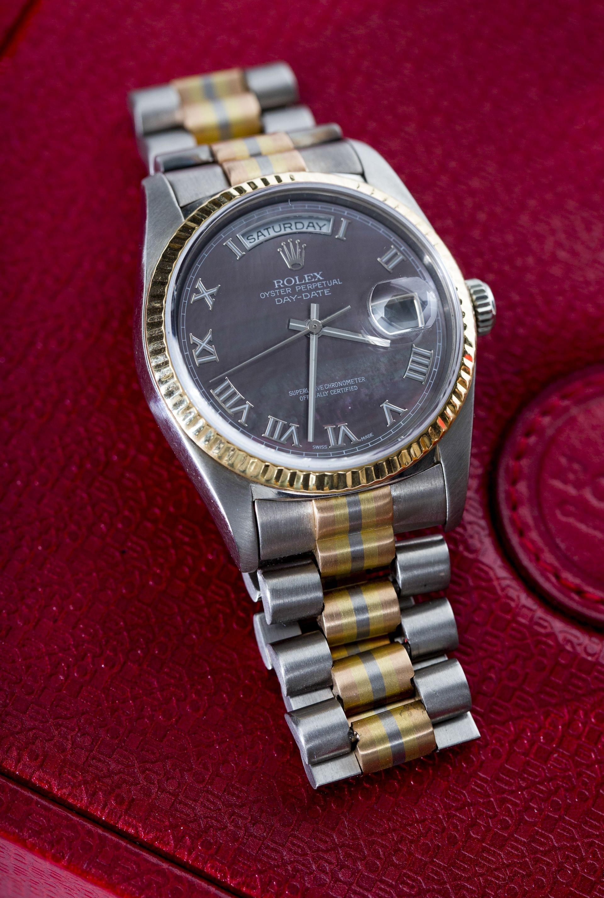 Cadran nacre noir, chiffres romains et aiguilles argentés, jour à 12h, date à 3h, réf. 18239B, 1990, or, or gris et or rose 750, D 35 mm, poids brut 140 g, dans un écrin, avec un certificat "Service Guarantee"
