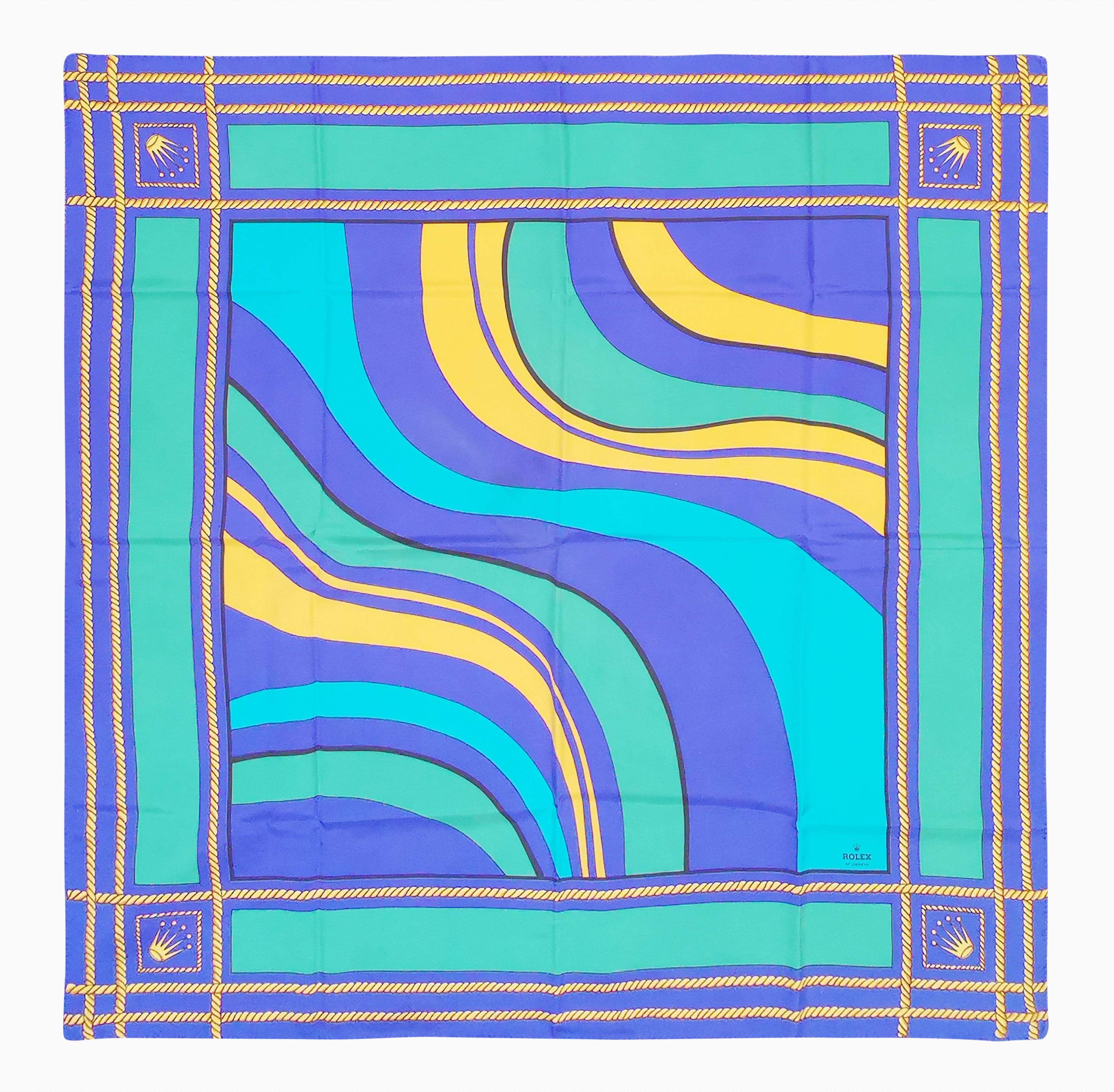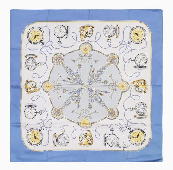 L'un à décor polychrome sur fond bleu vert et jaune ; l'autre à décor de montres à gousset sur fond blanc, bordure bleue et jaune, soie, 83x83 cm
