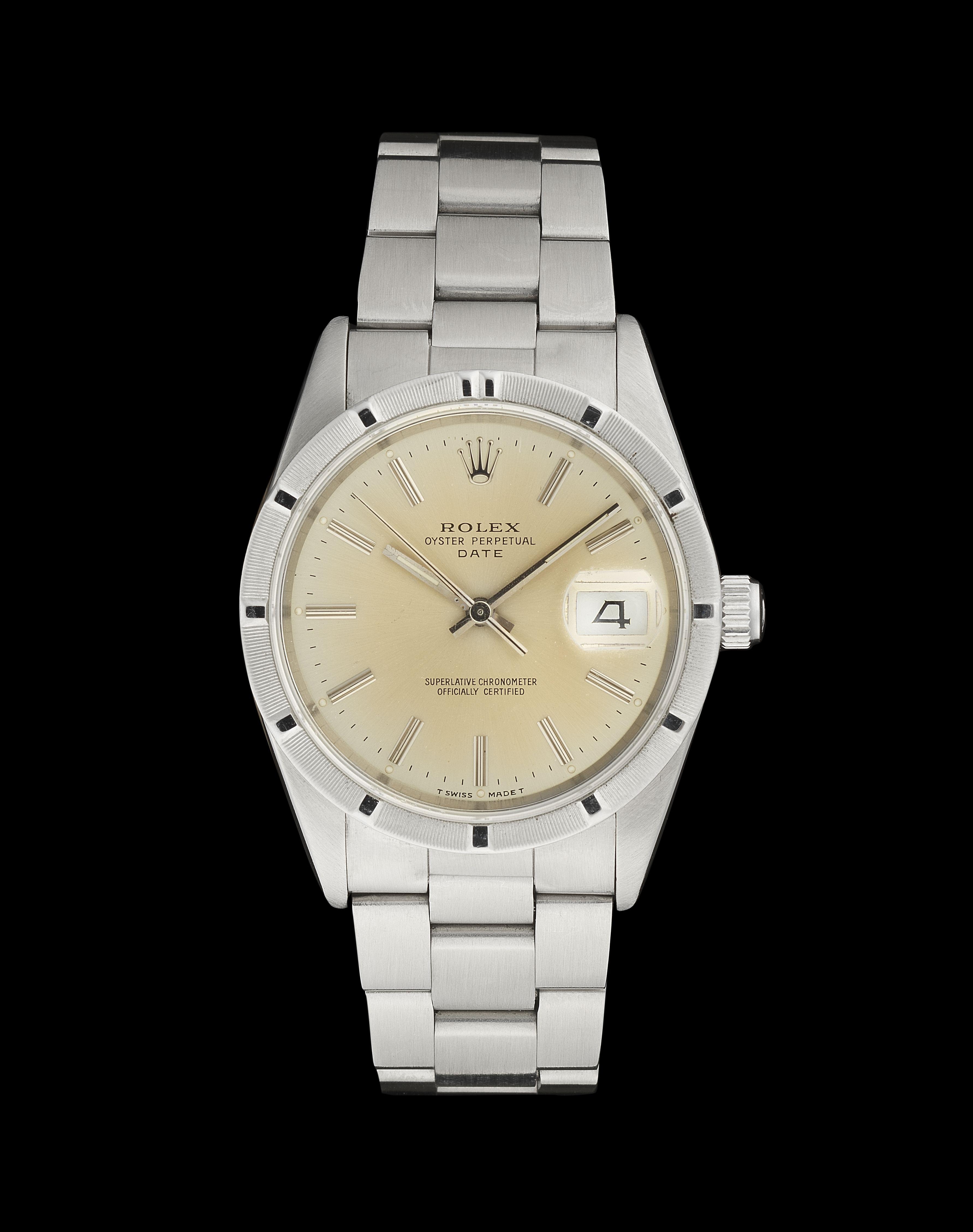 Cadran, aiguilles et index bâtons dorés, date à guichet à 3h, ré...