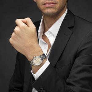 Cadran argenté, aiguilles et index bâtons noirs, or gris 750, D...