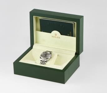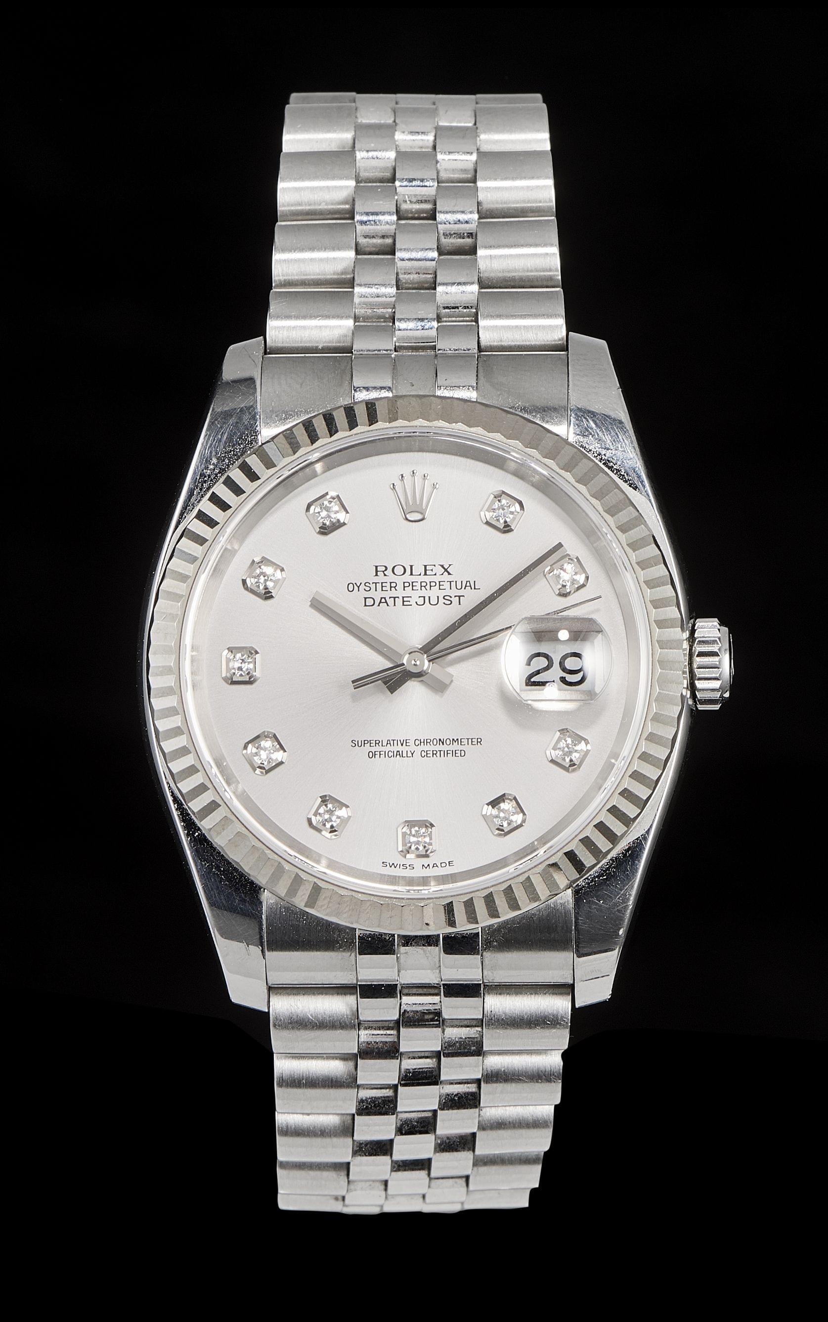 Cadran et aiguilles argentés, index diamants, date à guichet à 3h, réf. 116234, lunette en or gris, acier, D 36 mm, dans son écrin, avec "Attestation de Chronomètre officiel" mentionnant la date d'achat 8 novembre 2006