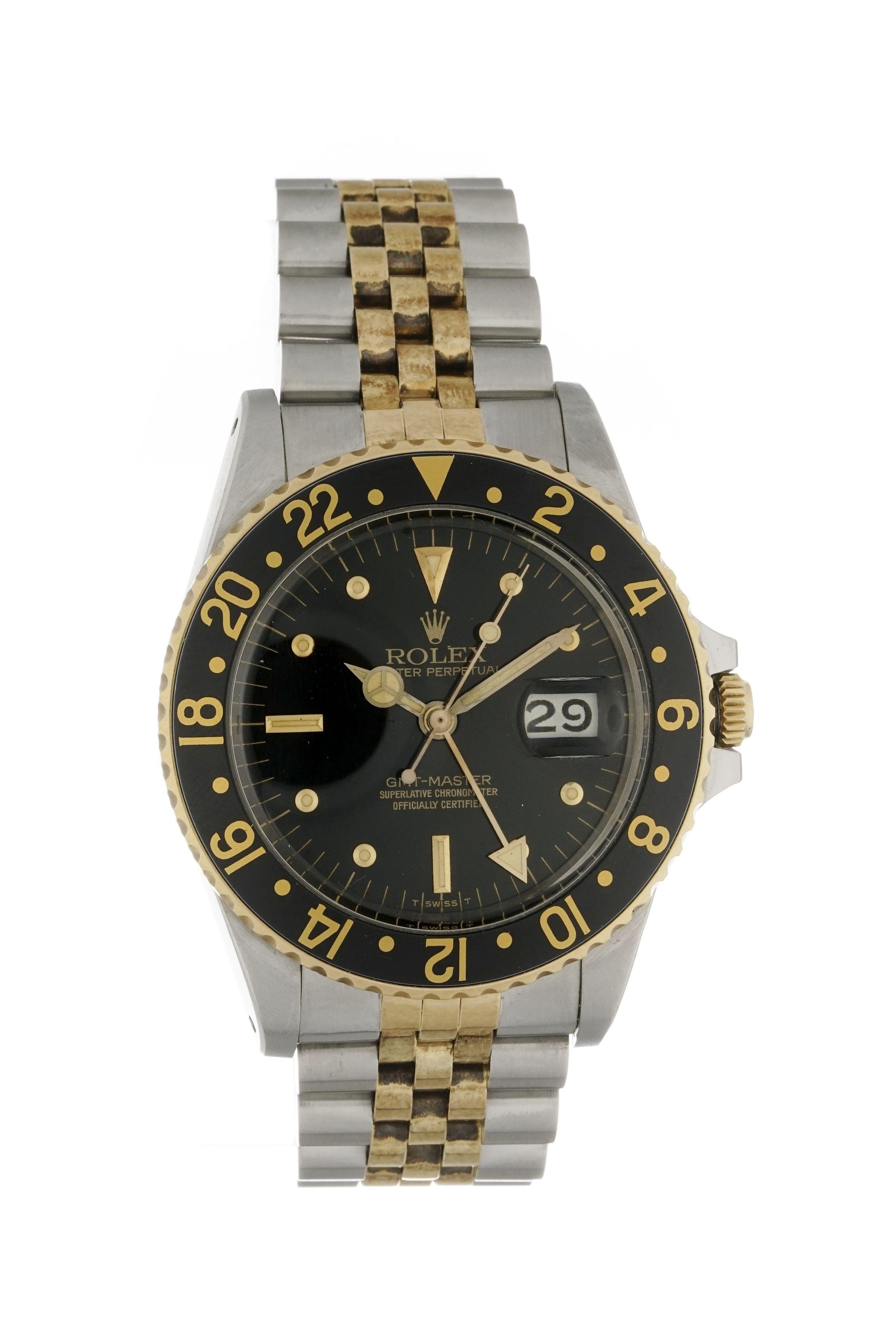 Rolex, Oyster Perpetual,GMT-Master, montre bracelet ronde automatique2 fuseaux horaires, cadran noir, chiffres arabes sur la lunette, aiguilles luminescentes, date à guichet à 3h, or 750 et acier, années 80, D 39 mm
