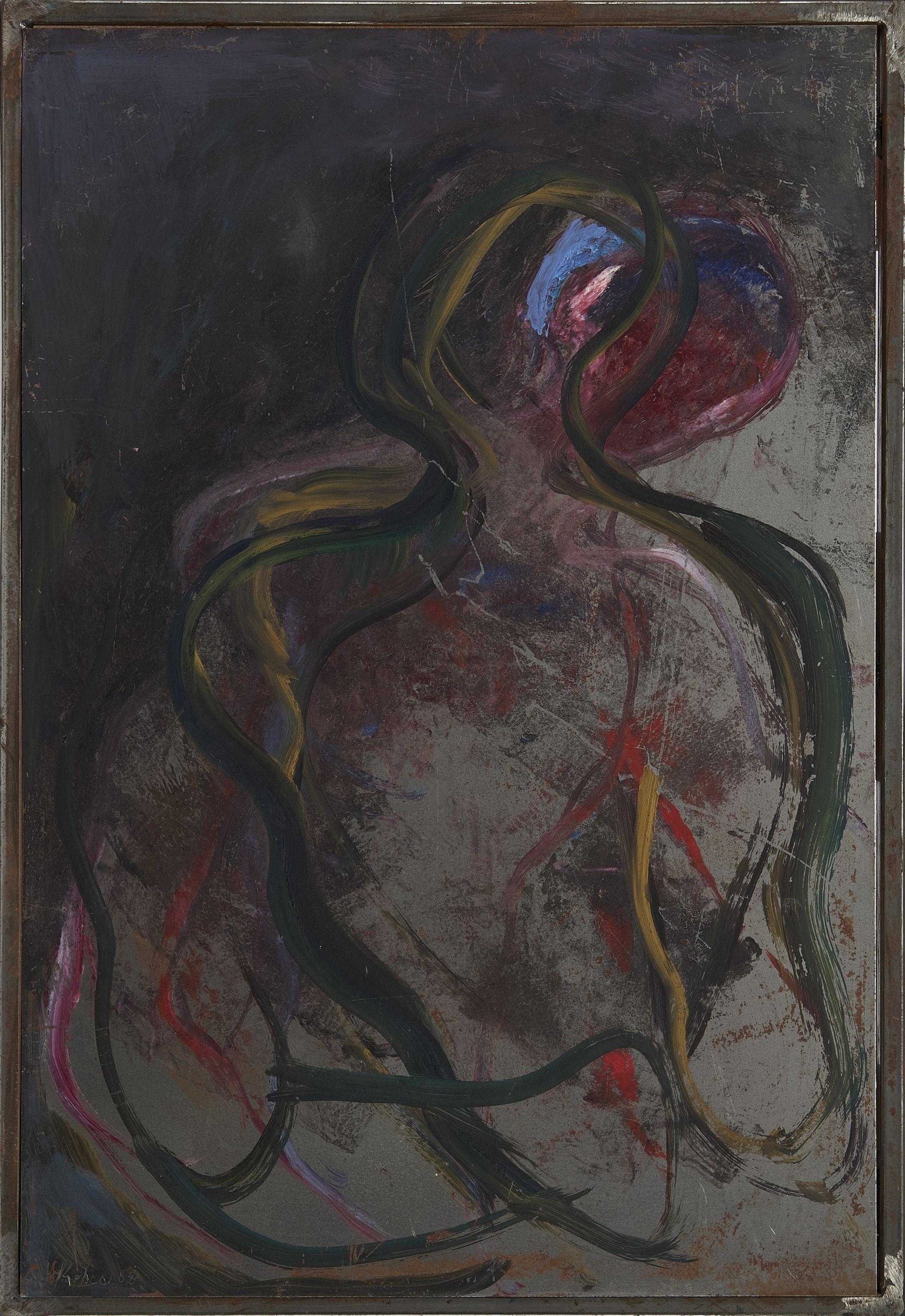 Silhouette, technique mixte sur métal, signée et datée 88 au dos, 50x33 cm