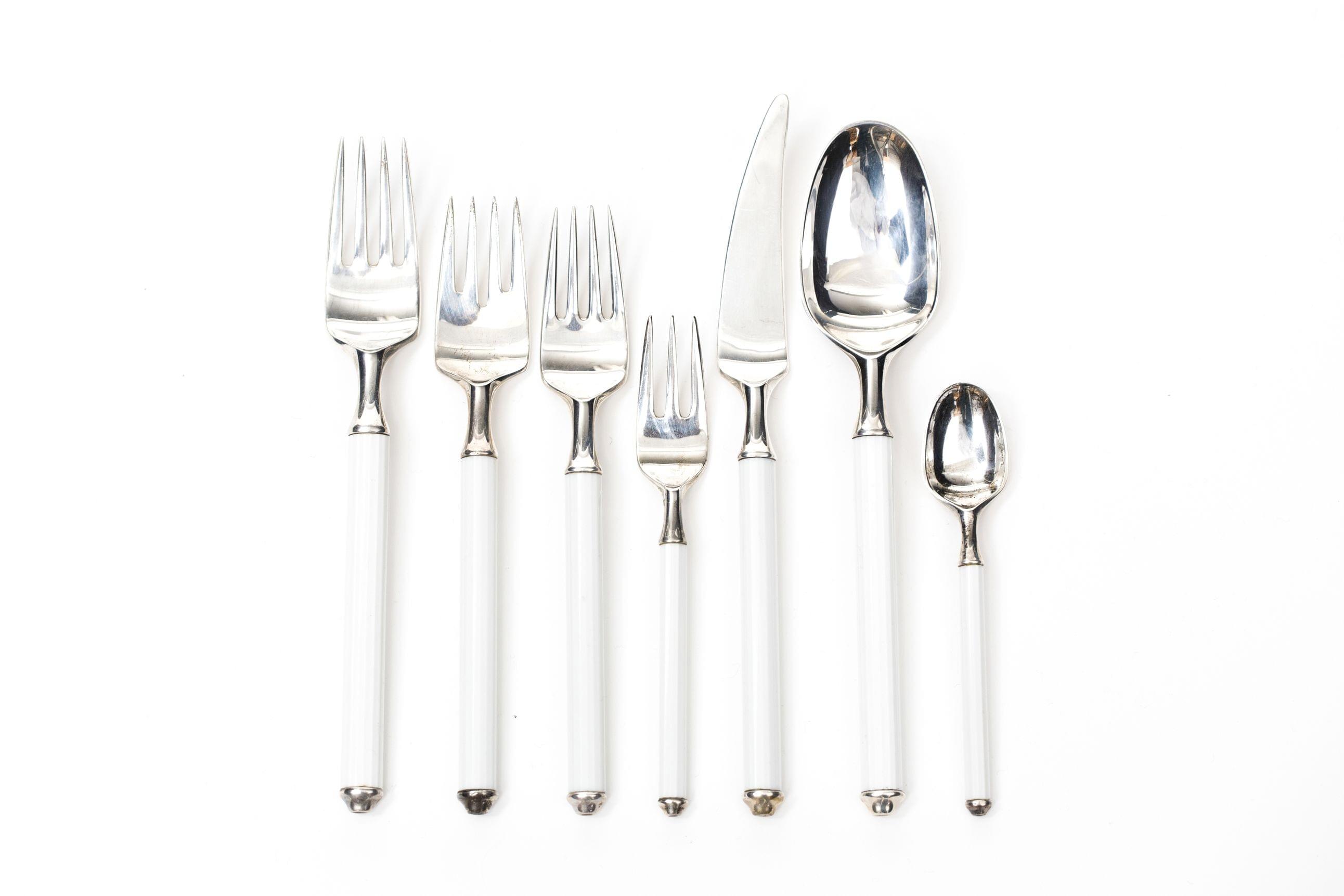 Rosenthal, ménagère en porcelaine blanche et argent 925, Allemagne, comprenant: 6 fourchettes, 6 couteaux et 6 cuillères de table, 6 fourchettes, 6 couteaux et 6 cuillères à entremets, 6 fourchettes et 6 couteaux à poisson, 6 cuillères à thé et 6 fourchettes à pâtisserie (60p). Collection David Sassoon