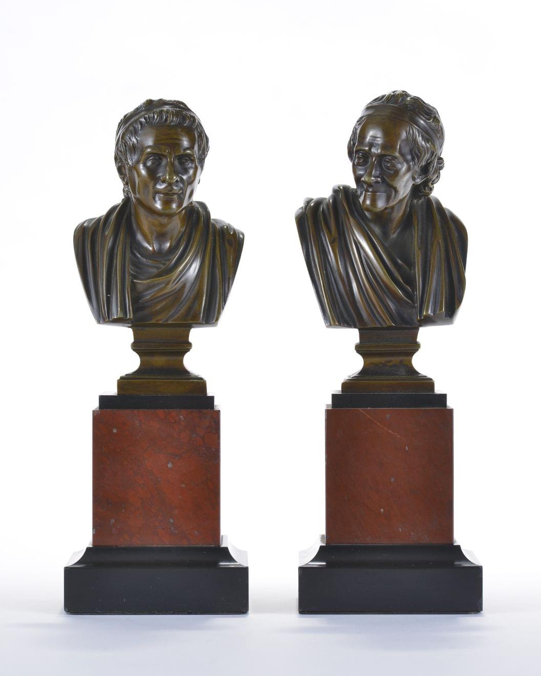 Paire de bustes, bronze patine brune et socle marbre, H 26 cm