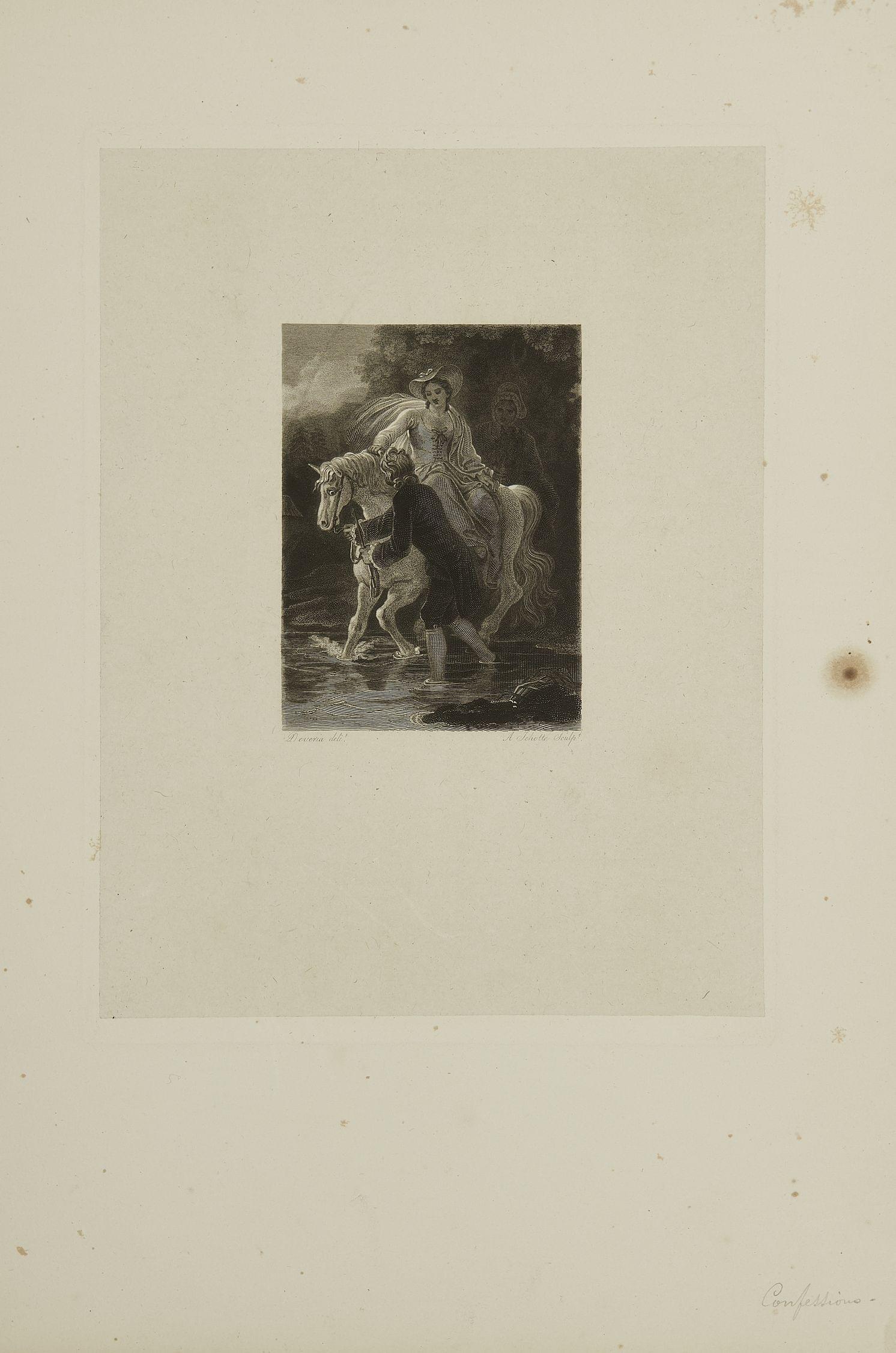 42 planches in folio sous chemise à dos de maroquin, étui. Suite de 2 portraits (Rousseau et Madame de Warens) et 40 figures par DEVERIA. Cette suite devait illustrer l’édition de Didot. Epreuves sur papier de chine appliqué sur grand vélin (quelques rousseurs, acc. à l’étui).