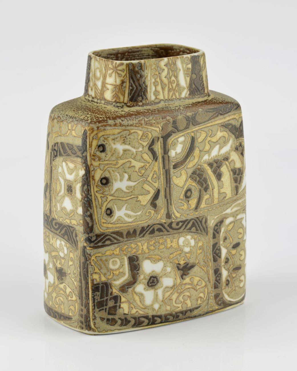 Vase à section rectangularie à col étroit, porcelaine émaillée dans les tons de brun, marqué et signé, circa 1960, H 19.5 cm
