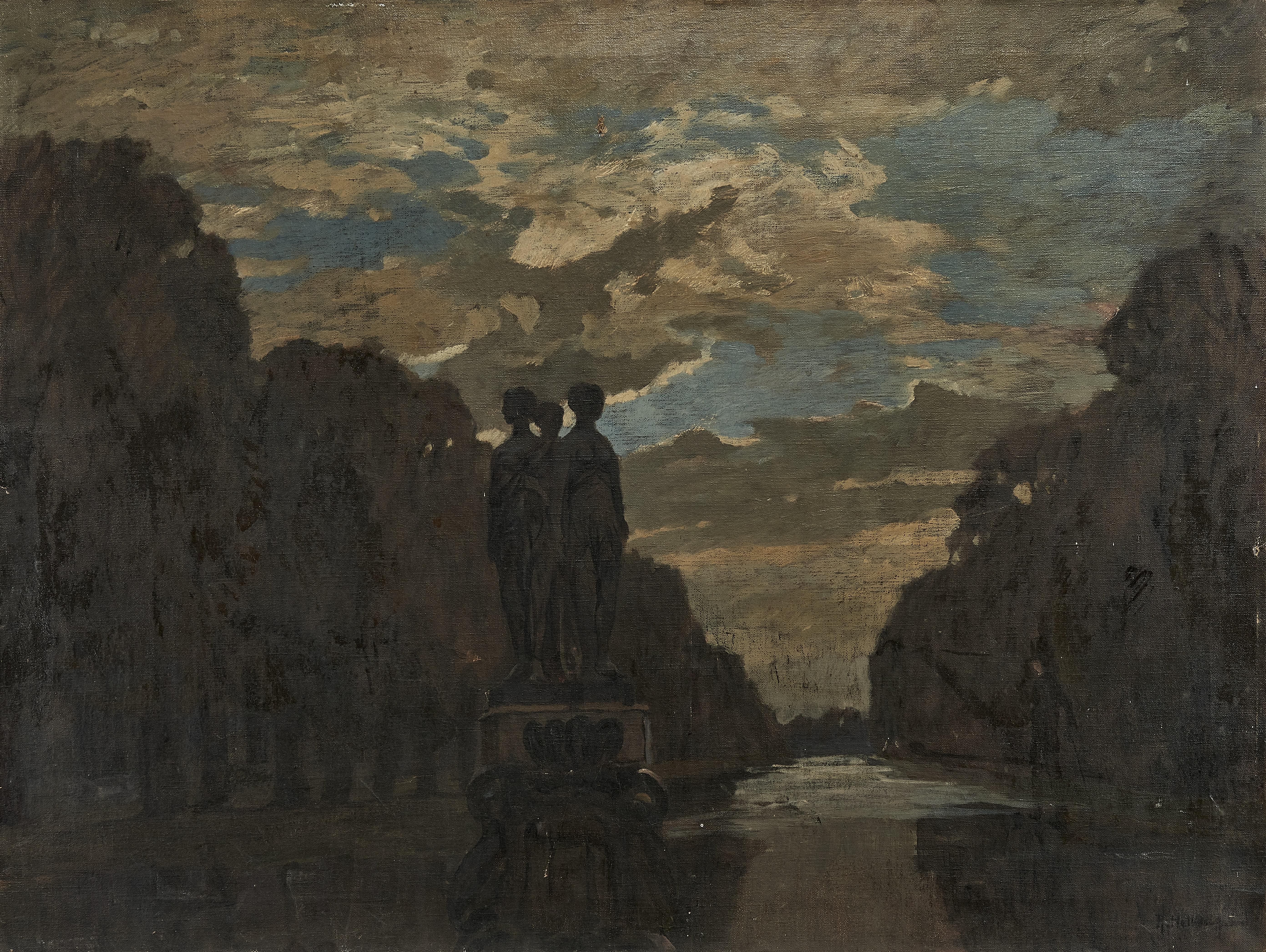 Statue des trois grâces dans le parc au crépuscule, huile sur toile, signée, 73x98 cm