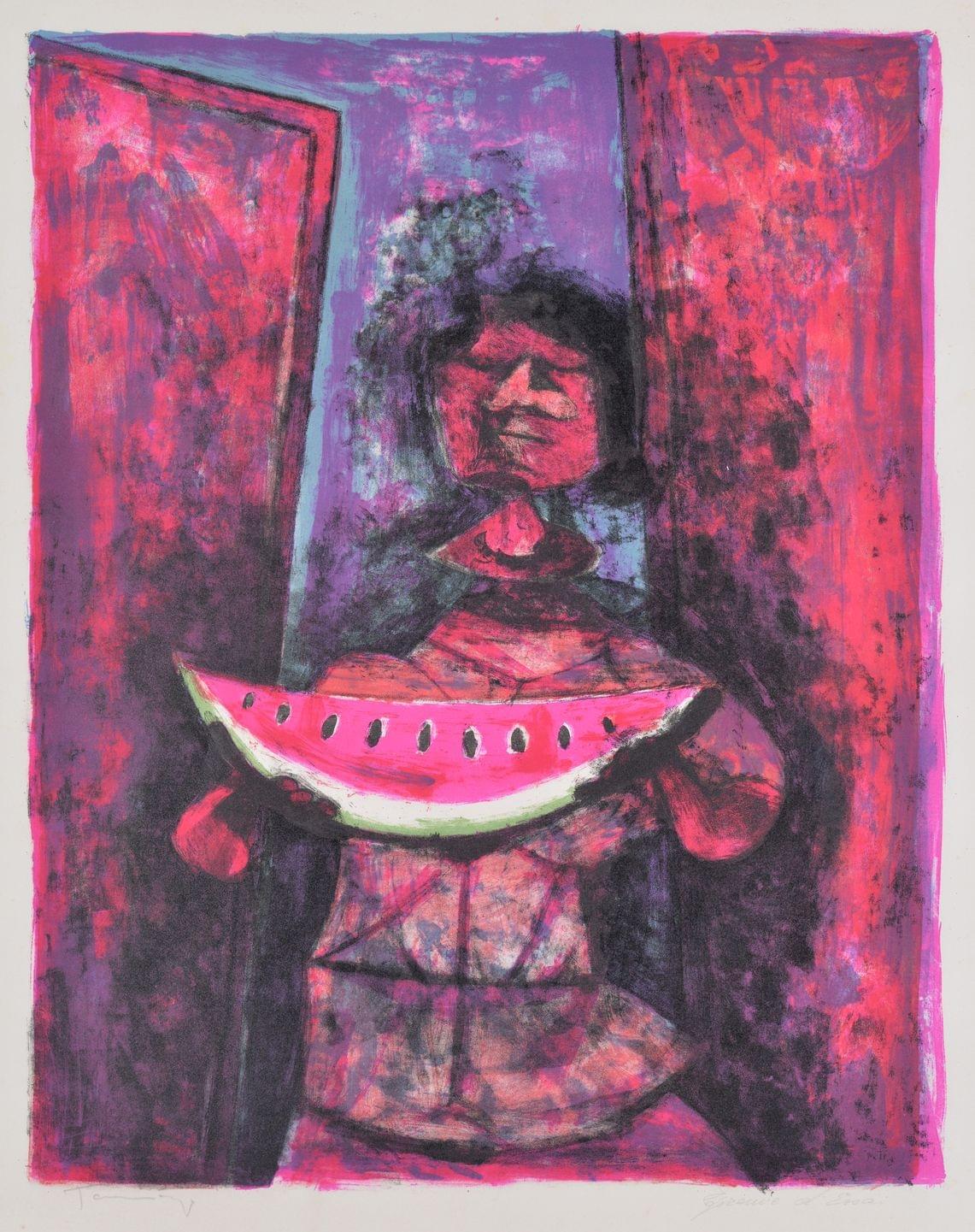 Personnage à la pastèque, lithographie en couleur, épreuve d'essai, signée, 65x50 cm