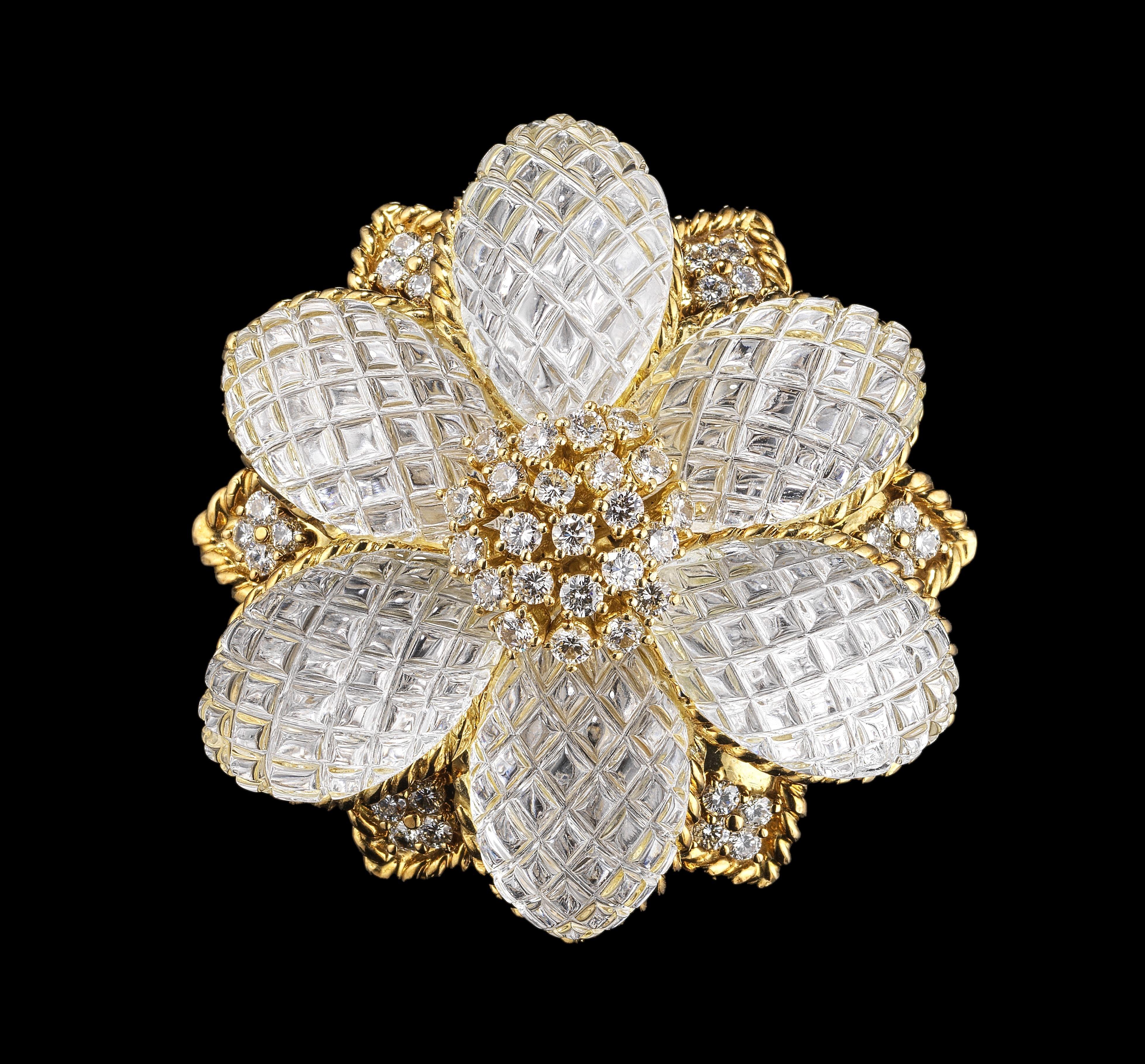 107. Sabbadini, importante broche fleur aux pétales de cristal de roche sculpté rehaussés de diamants et au cœur pavé de diamants (env. 2 ct)