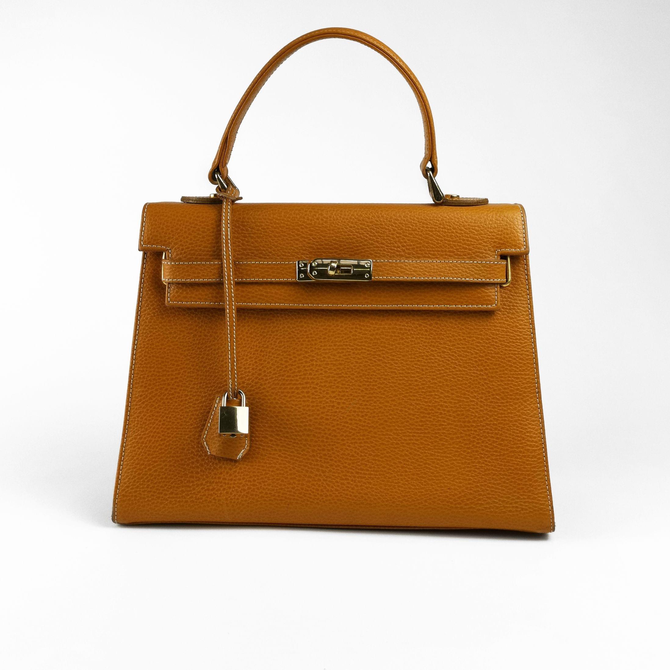 Cuir grainé camel, garniture en métal doré, intérieur en cuir beige, 24x32x12 cm