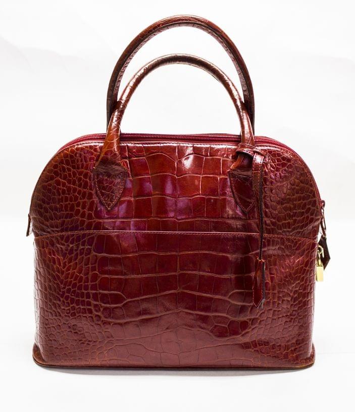 Cuir rouge, impression croco, fermeture Eclair, double anse, 26x35x14 cm