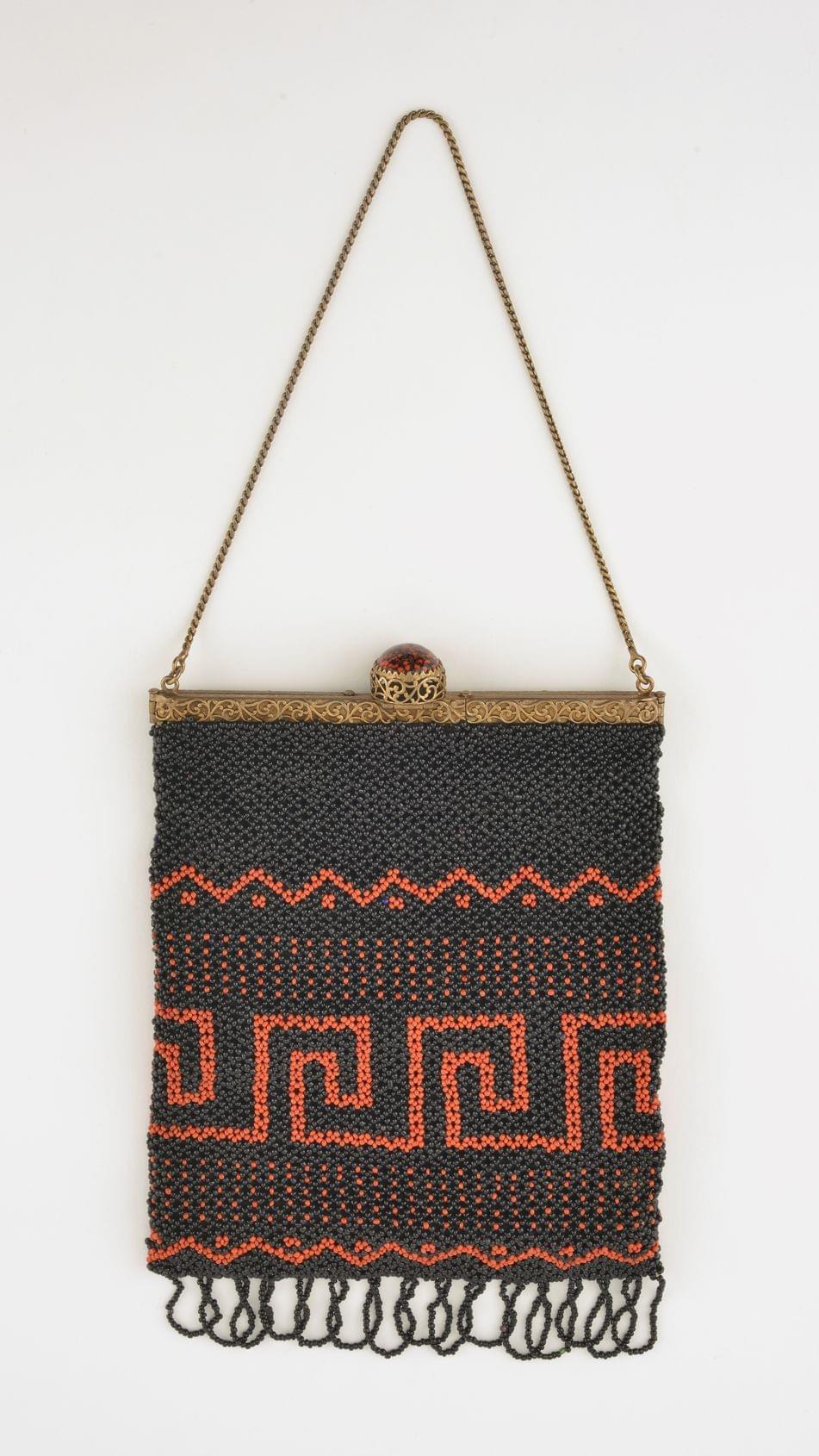 Métal martelé, fermoir cabochon en émail, perles noires et orangées, 24x18 cm