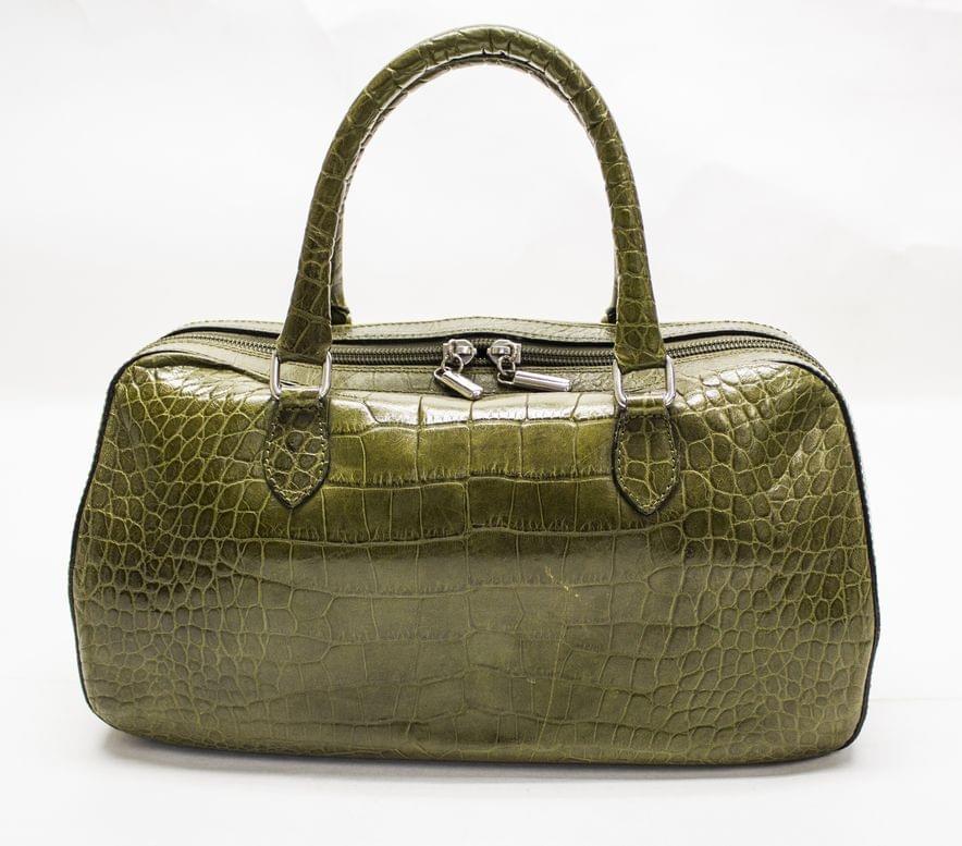 Cuir olive façon croco, intérieur en cuir de veau noir, un compartiment à double fermeture Eclair, double anse, 16x32x12 cm
