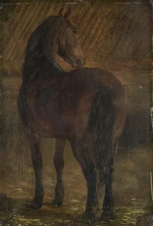 Cheval à l'étable, huile sur toile, signée et datée au dos septe...