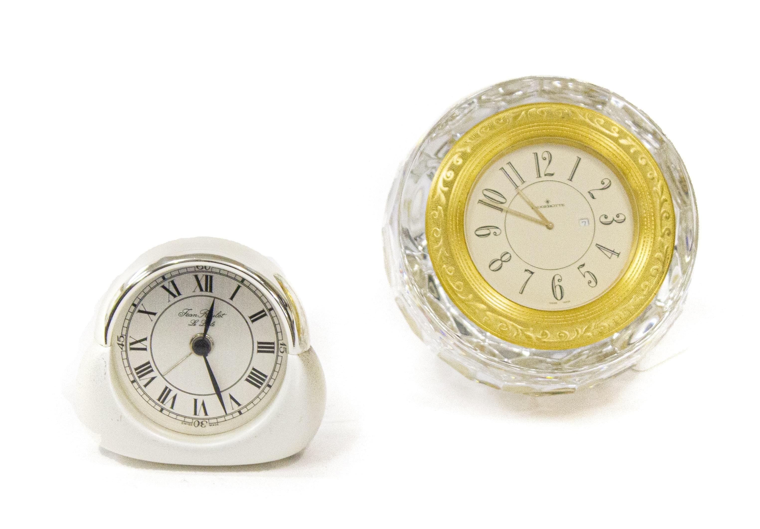 L'une en cristal à cadran beige, aiguilles argentées, chiffres arabes noirs, date à guichet à 3h, et l'autre avec dôme imitation lapis-lazulis, cadran gris, aiguilles et chiffres romains noirs, métal doré, H 14 cm