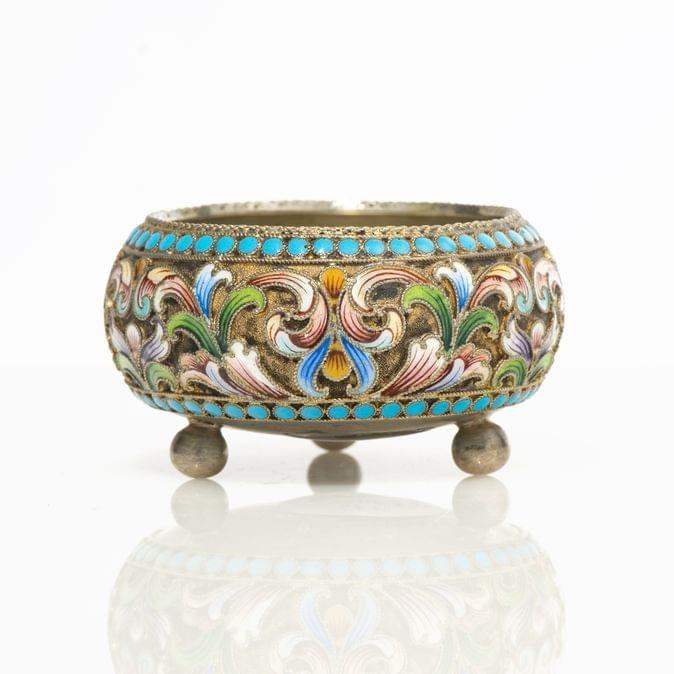 73. Petit kovsh sur pied ou Korchik de forme navette à décor de rinc...