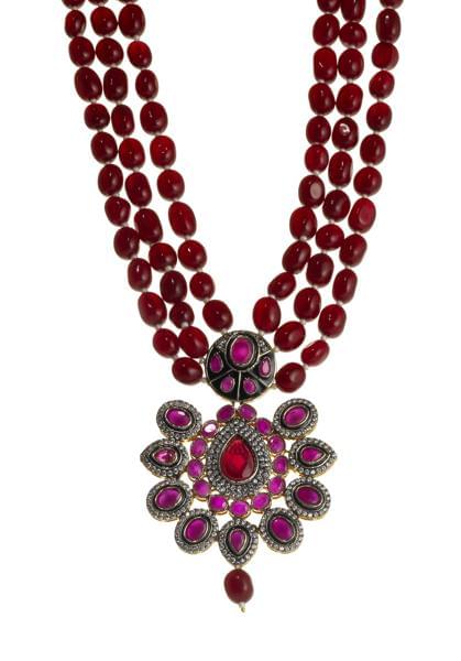 3425. *Collier composé de trois rangs de perles de quartz teintées rou...