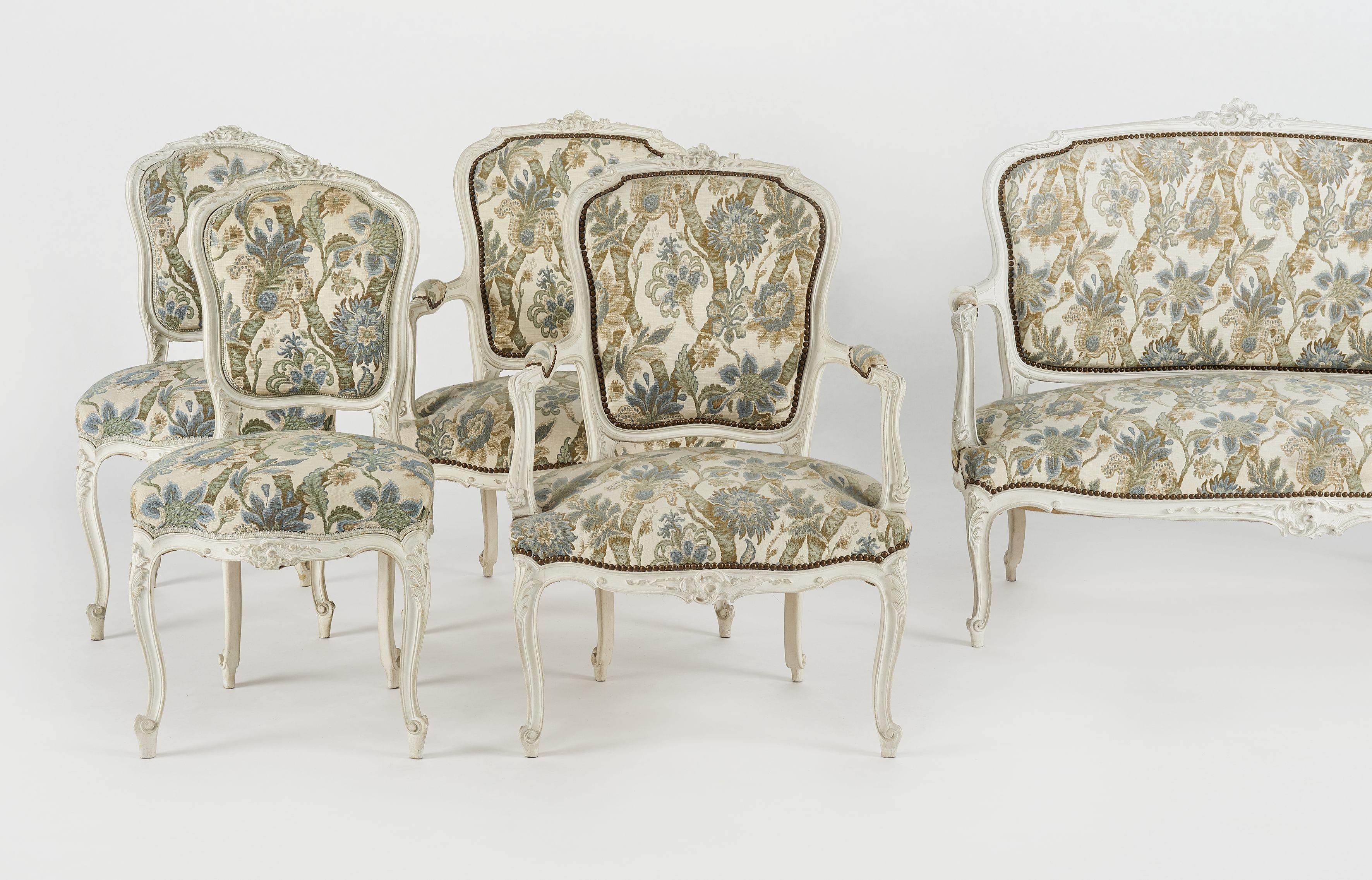 4637. Salon de style Louis XV comprenant un canapé, deux fauteuils, deux chaises, circa 1900