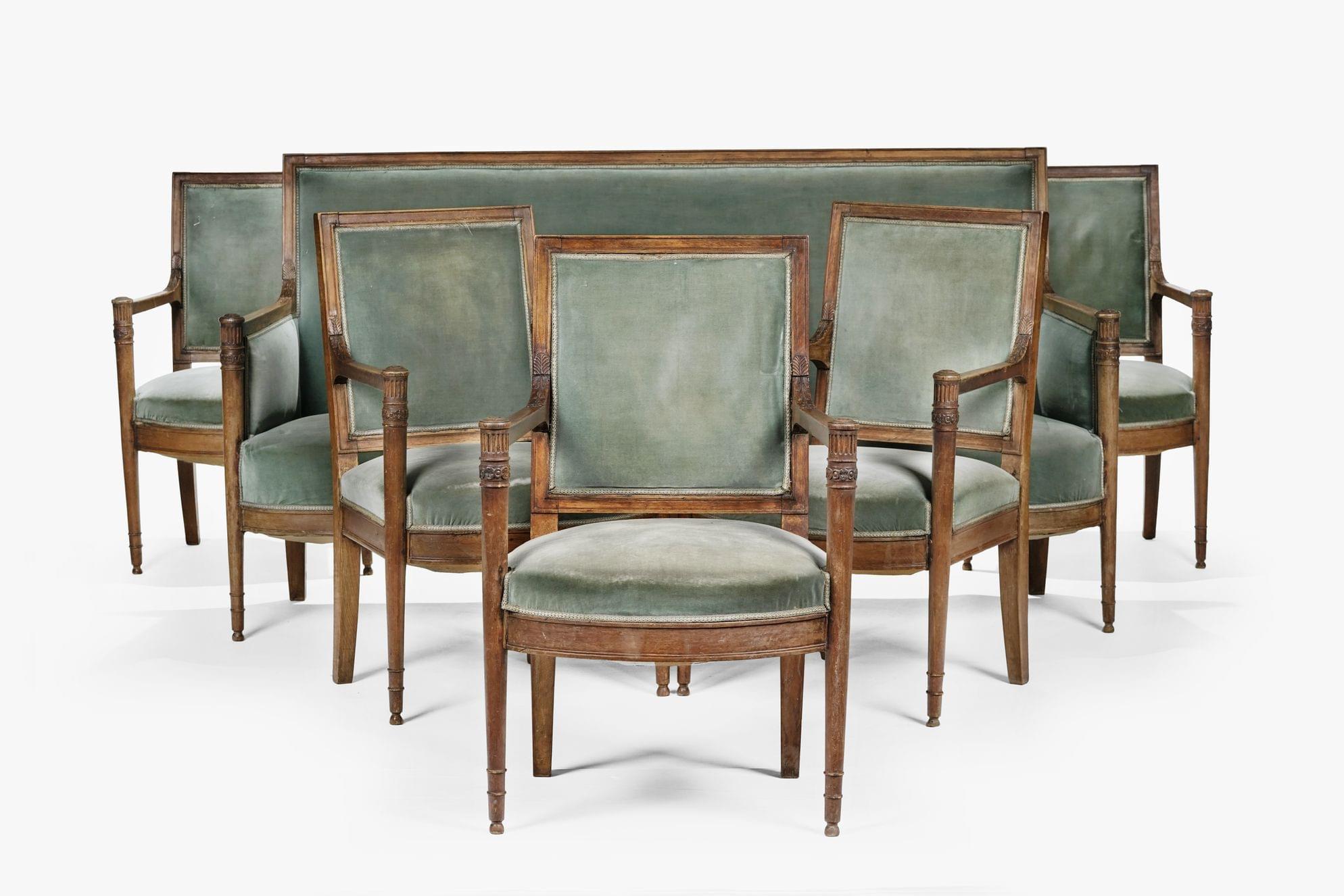 Noyer, accotoirs bagués d'entrelacs, comprenant un canapé et cinq fauteuils, garniture de velours vert d'eau