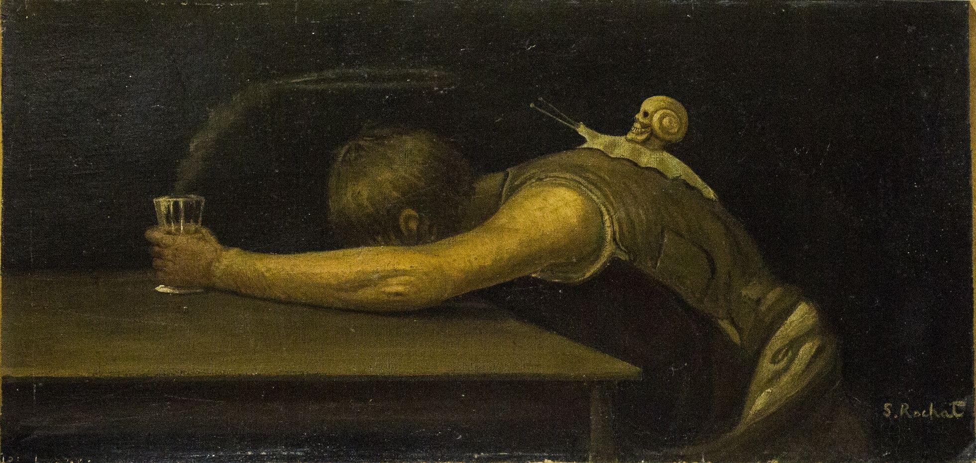 Le Buveur, huile sur toile marouflée sur carton, signée, 27x59 cm