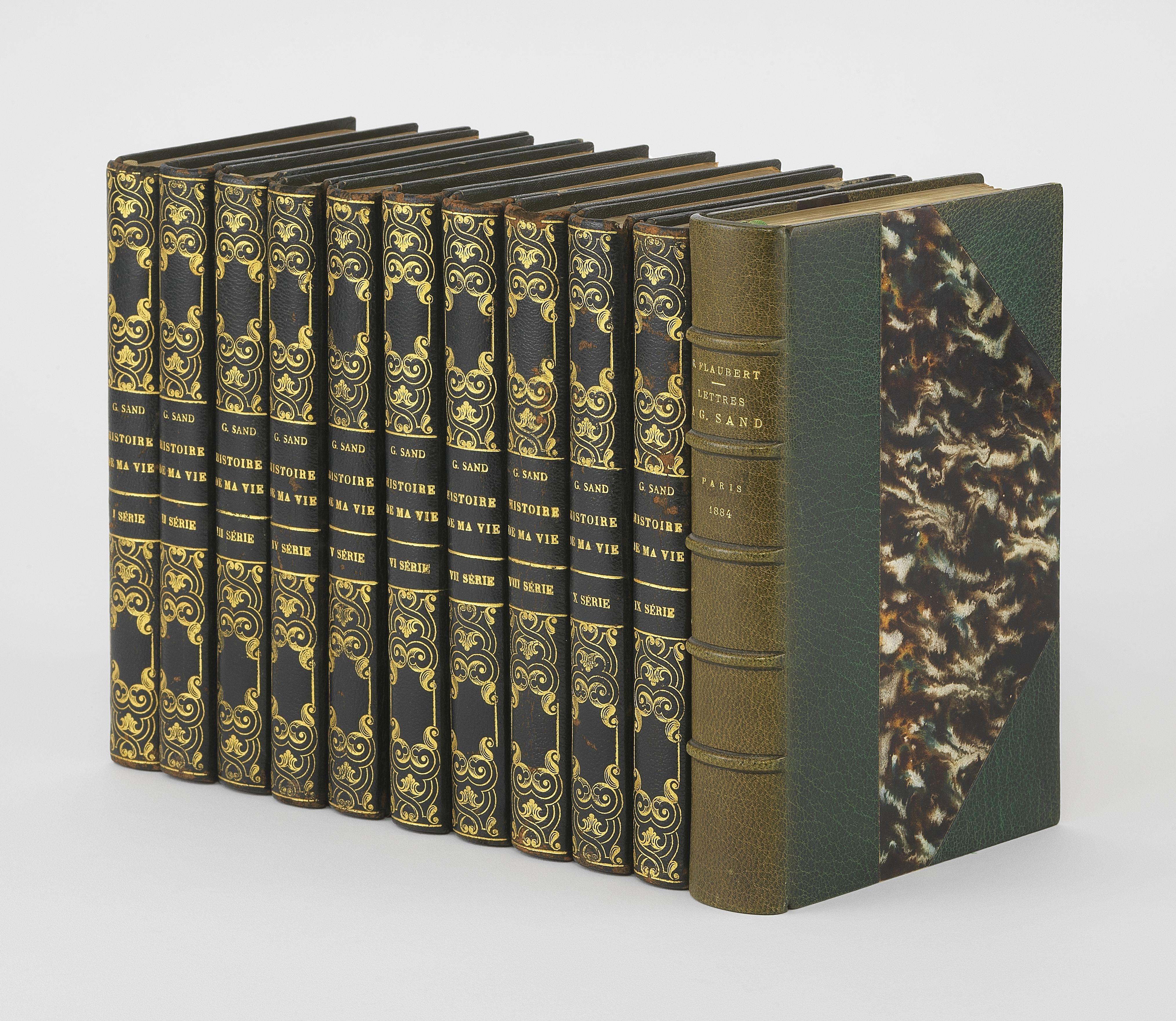 d sur les plats, têtes dorées. Reliure de l’époque. Première édition. - FLAUBERT (Gustave) : Lettres de Gustave Flaubert à George Sand. Paris, Charpentier, 1884 ; in 12, demi-maroquin vert à coins, dos à nerfs, couvertures conservées. Reliure de David. Un des 50 ex. num. sur Hollande.