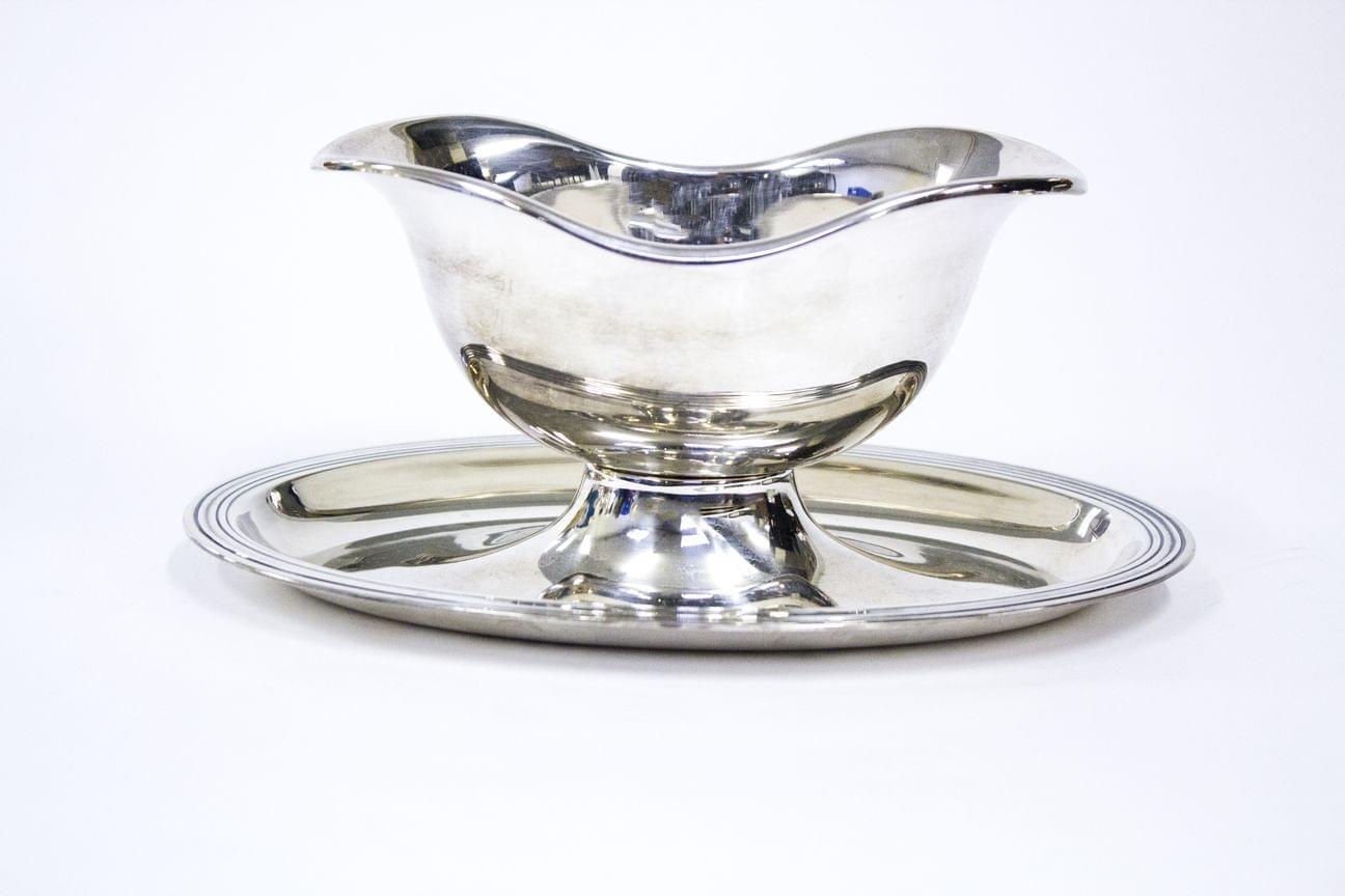 155. Ecuelle ovale couverte sur présentoir de style Louis XV à bordur...