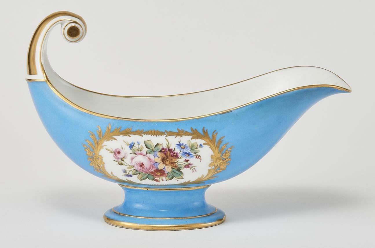 857. Saucière turquoise à décor de fleurs dans un médaillon en réserve