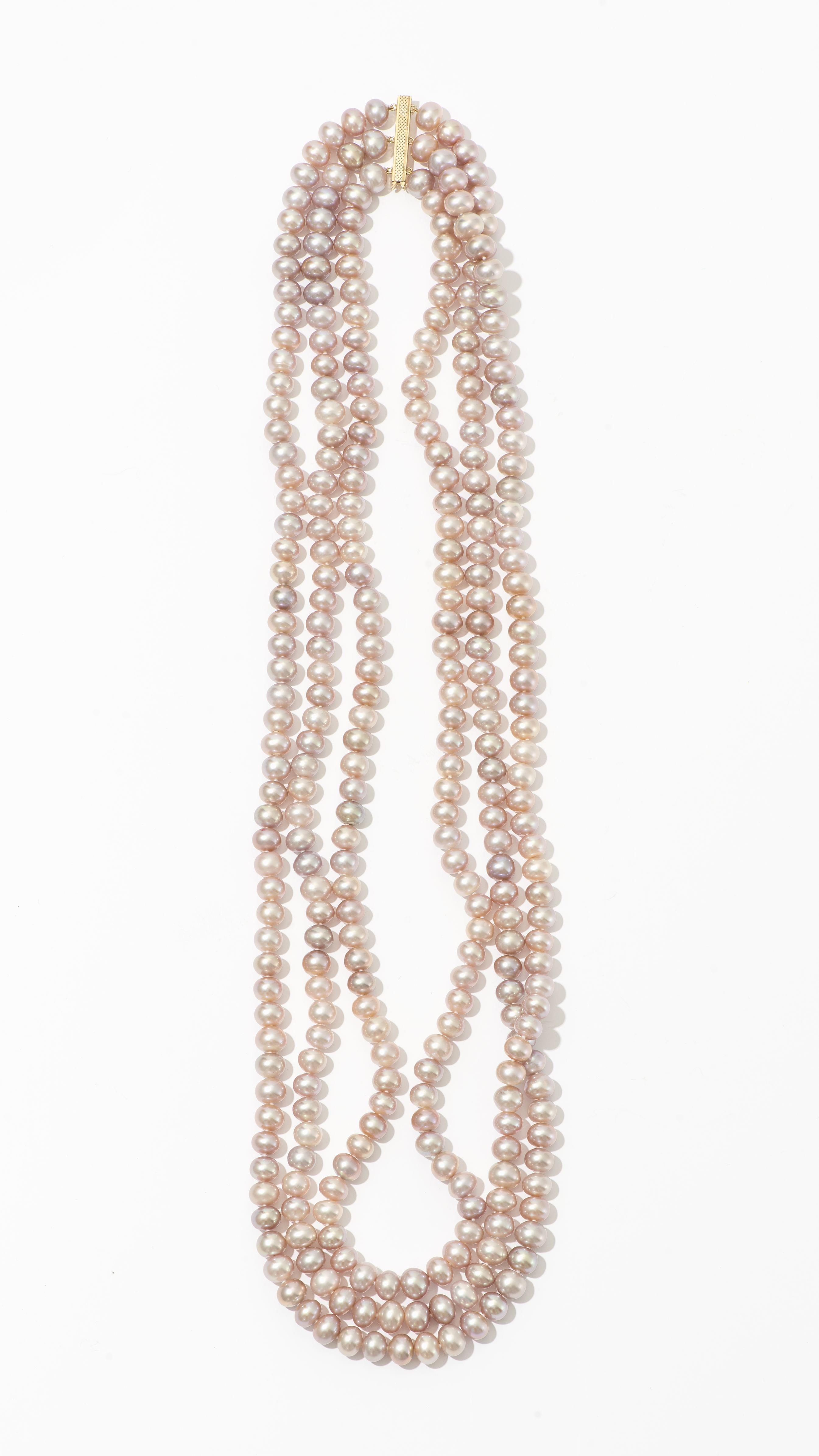 84. Sautoir de boules de jade rose et de quartz rose alternées de bo...