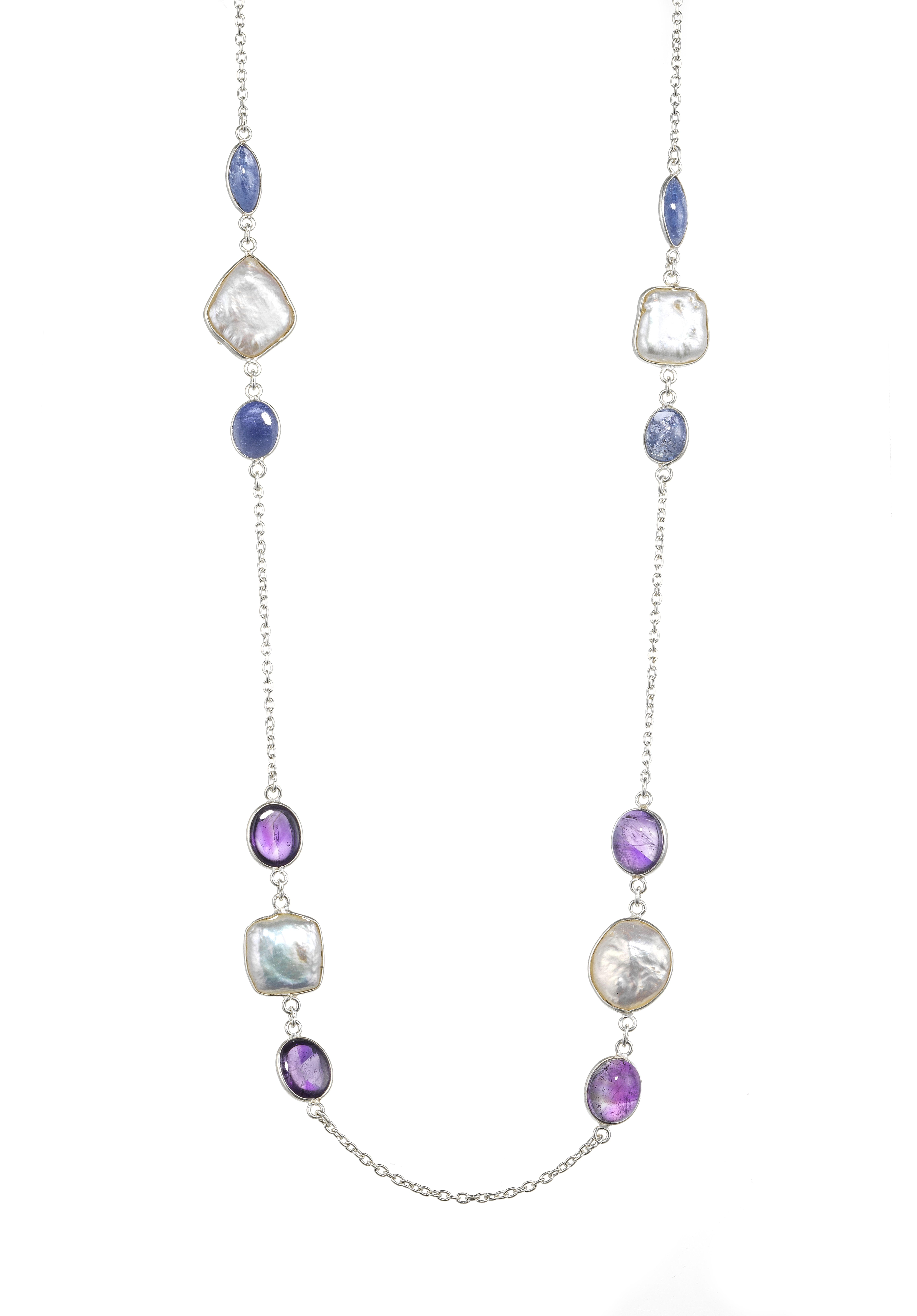 3190. *Sautoir à maille ovale ponctuée de perles de nacre alternées d'améthystes et de tanzanites