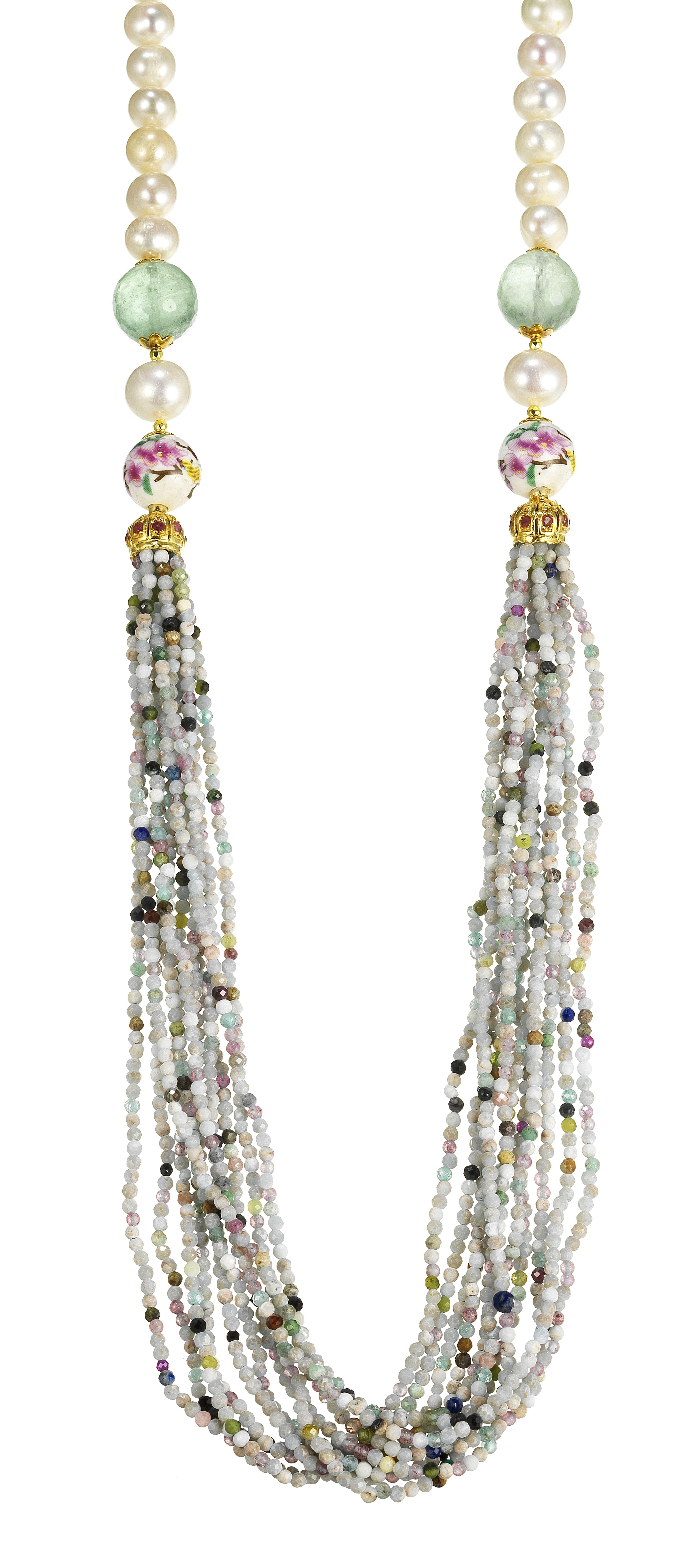 3226. *Sautoir composé d'un rang de perles retenant de nombreux rangs de perles en céramique