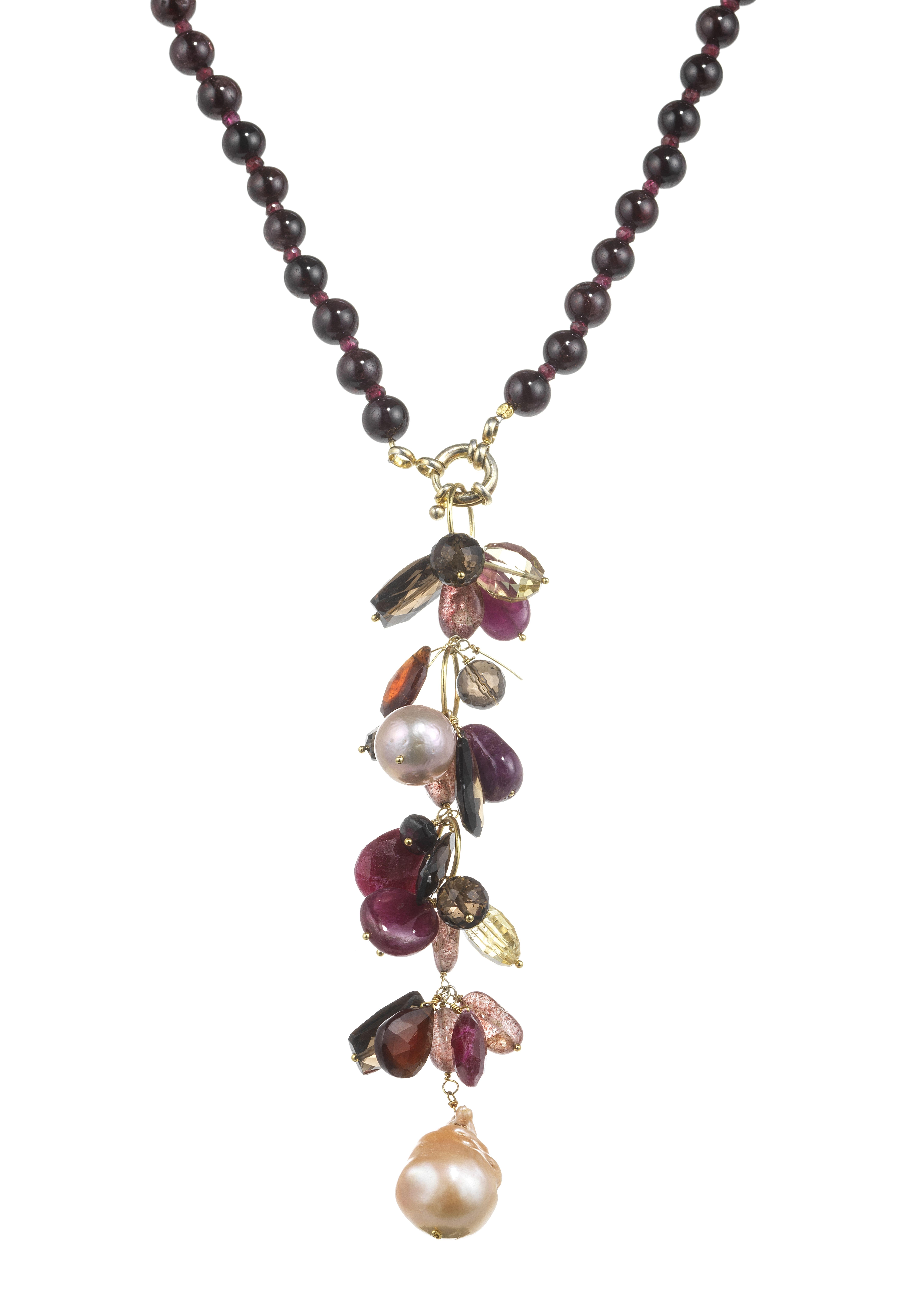 Retenant un pendentif formé de diverses pierres telles que le grenat, le rubis, la citrine et la tourmaline, vermeil 925, L 75 cm. Pour les lots précédés d'un *, la TVA de 7,7% est due sur l'entier du prix d'adjudication.
