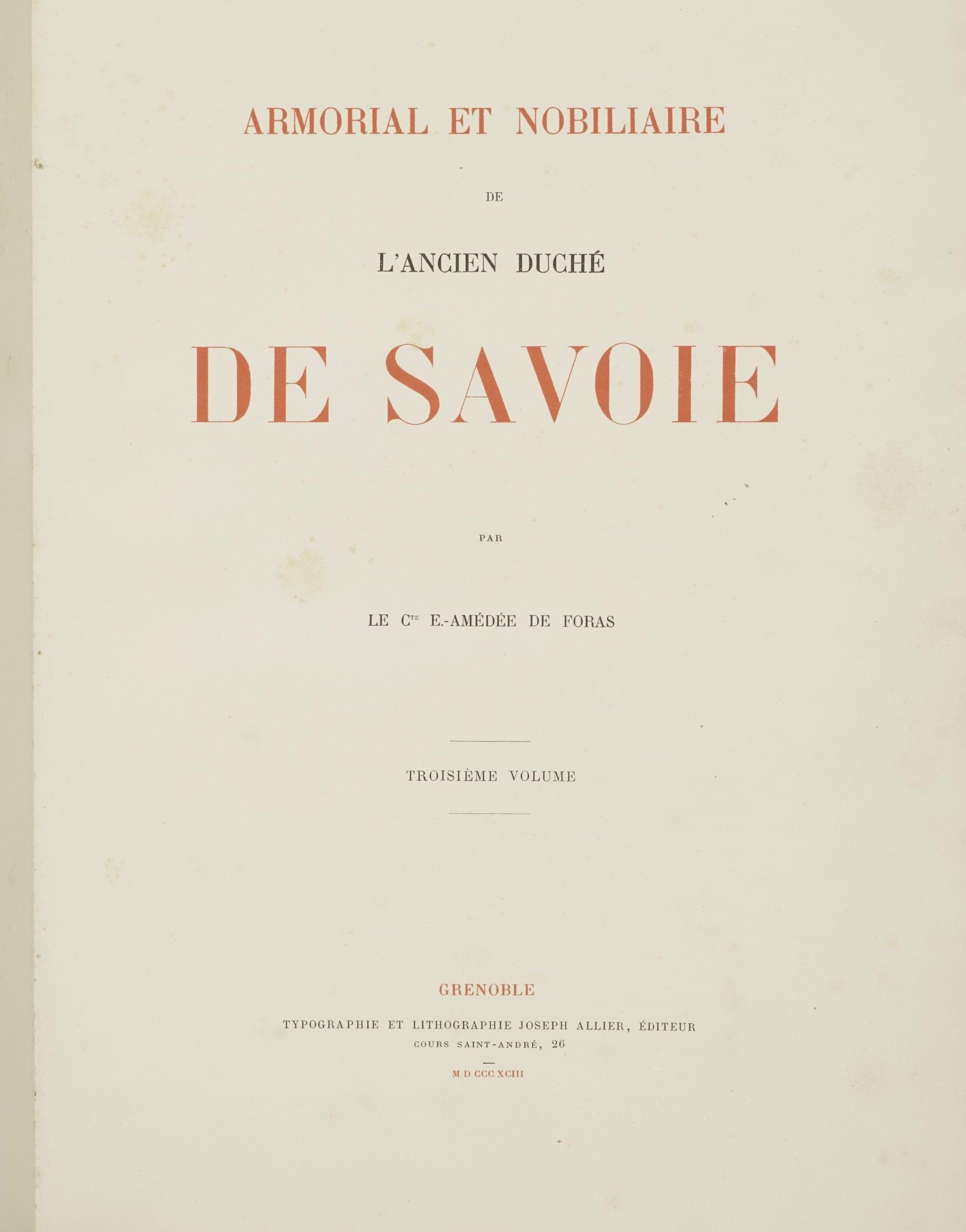 81. SAVOIE. FORAS (comte de) : Armorial et Nobiliaire de l’ancien duché de Savoie. Grenoble, 1863-1938