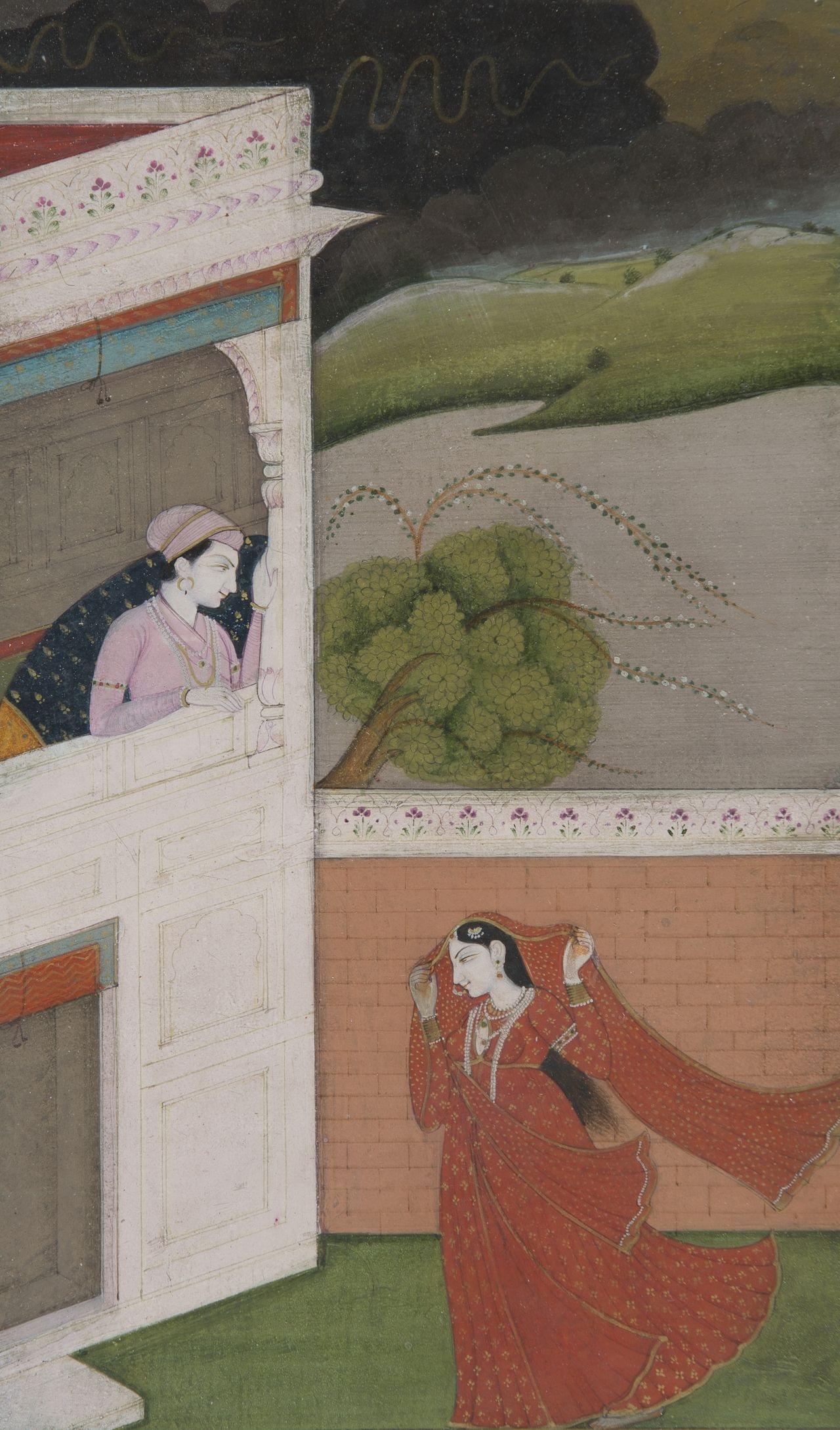 1092. Scène galante nocturne, jeune femme au voile rouge école de Kangra, Inde