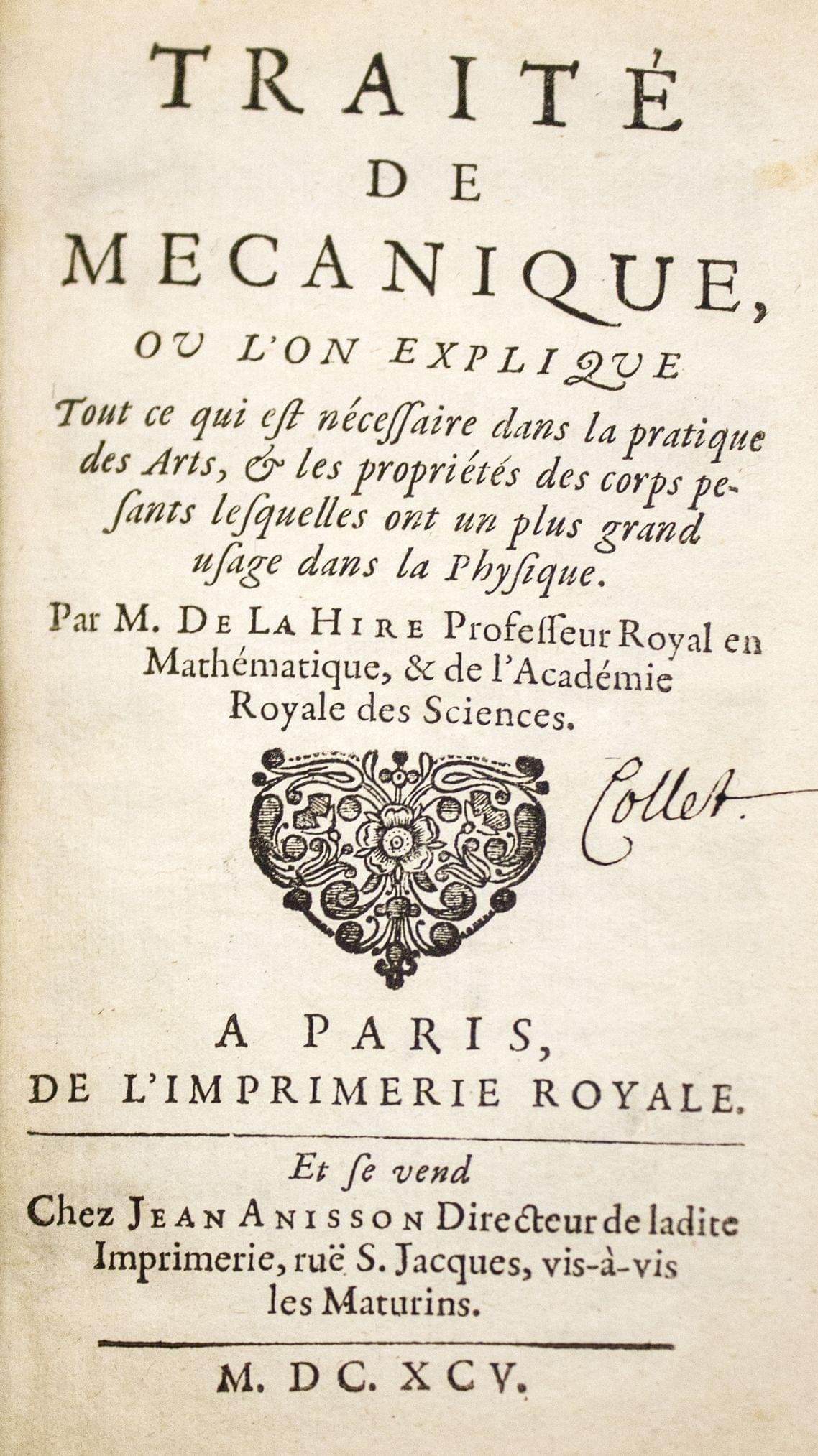 - LA HIRE : Traité de Mécanique. Paris, Imp. Royale et Anisson, 1695 ; in-12, basane Blonde ornée de l’époque. Ed. originale. Nomb. dessins gravés dans le texte.