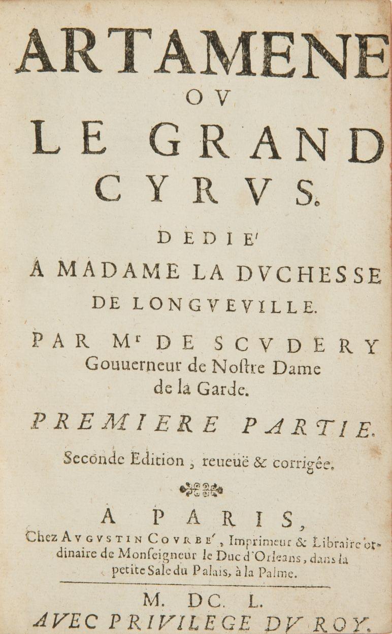 98. SCUDERY (Madeleine de): Artamene ou Le Grand Cyrus. Paris, Aug. Courbé,1650;