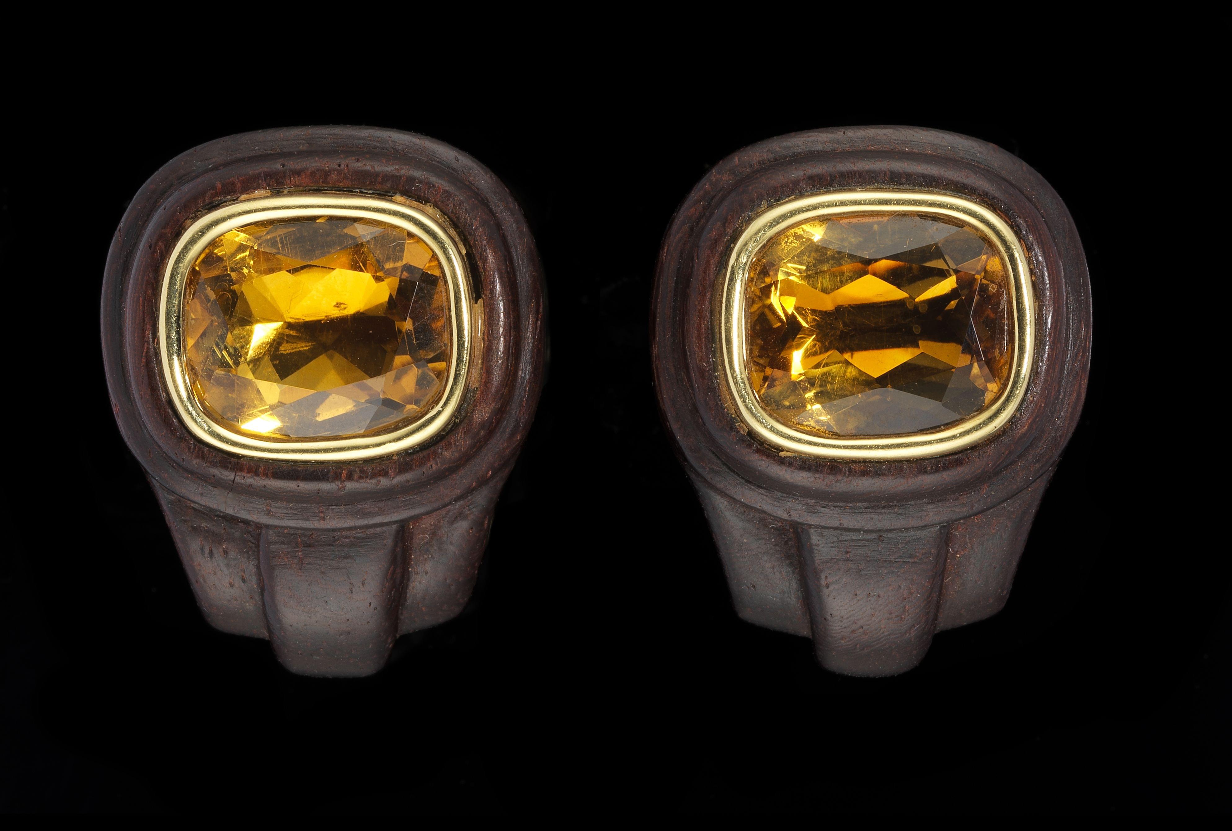 201. Seaman Schepps, clips d'oreilles en bois exotique sertis de citrines taille coussin ovale