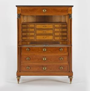 Quatre tiroirs et un abattant, montants à têtes à l'antique, acajou et bois noirci, bronze, 140x102x55 cm