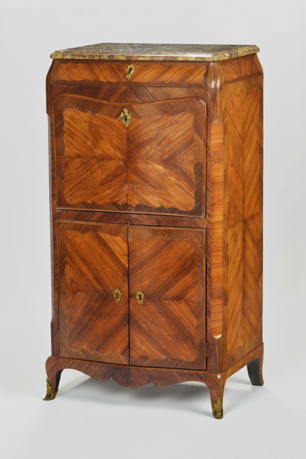 Un abattant et deux vantaux, placage de bois de rose et bois de violette, marbre brèche d'Alep, 122x65X36 cm. Léonard Boudin, reçu maître en 1761