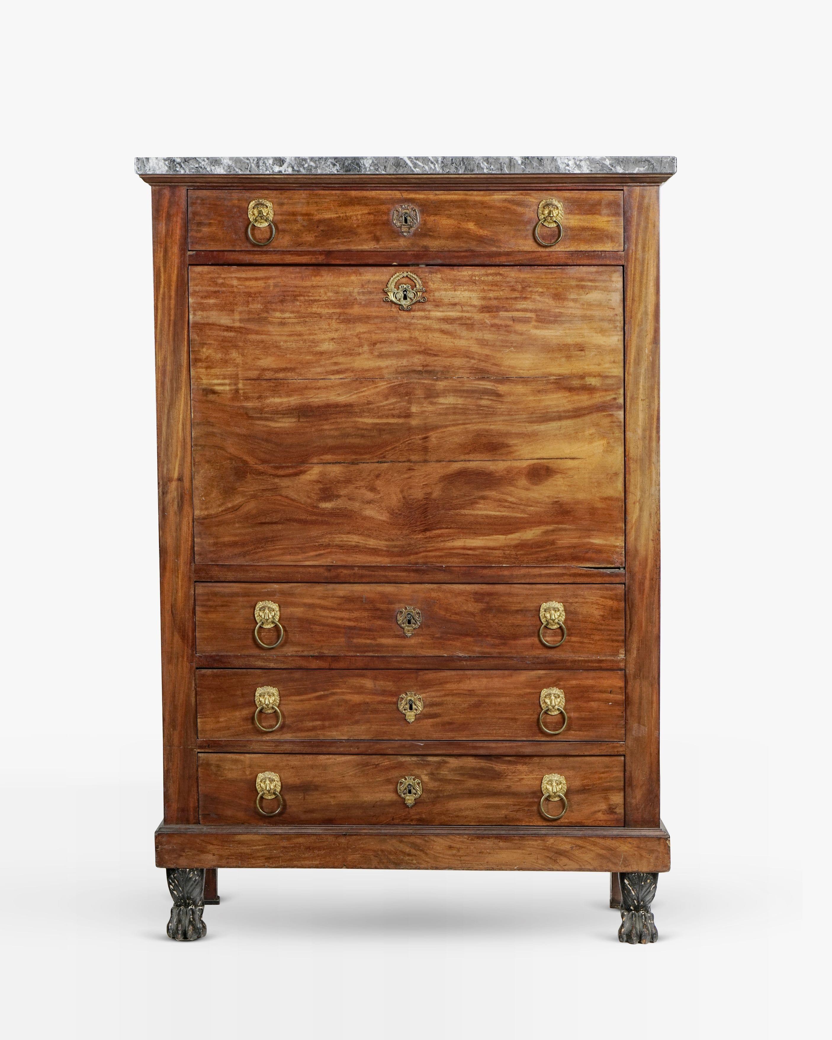 Un abattant, quatre tiroirs et pieds griffes, acajou et marbre gris saint-Anne, 139x97x42 cm