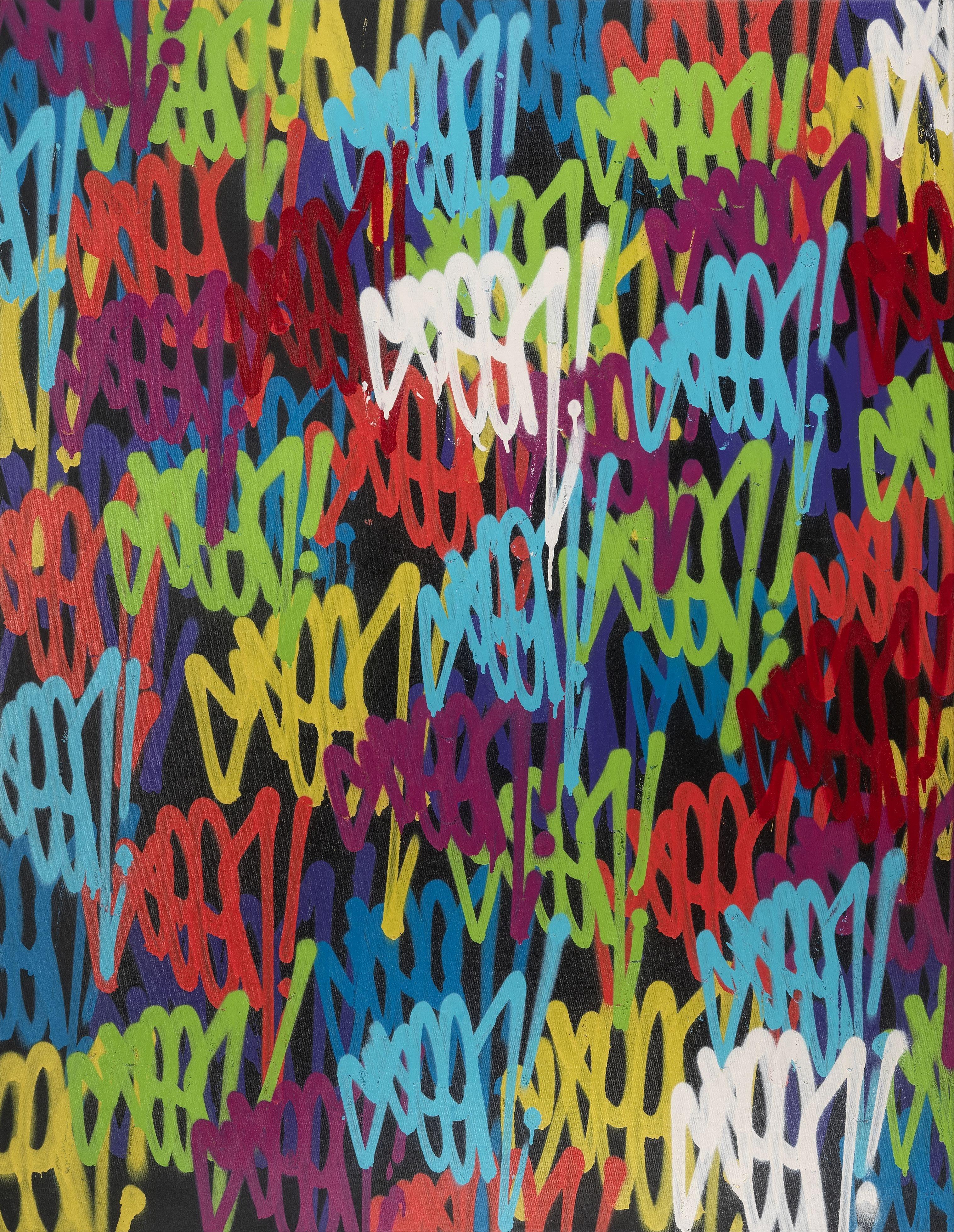 Blue Multi Tags, aérosol sur toile, signé au dos, 124x66 cm. On...