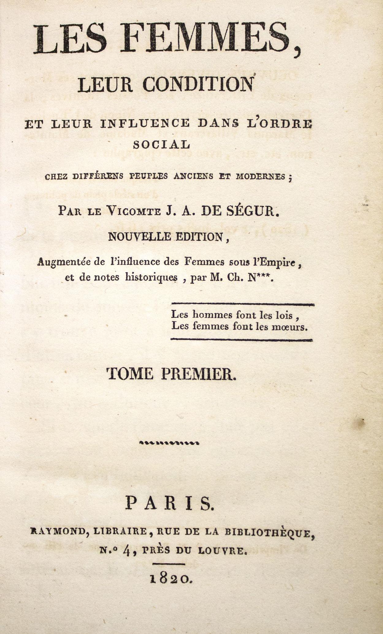 SEGUR (vicomte de) : Les Femmes, leur condition et leur influence dans l’Ordre social. Paris, Raymond, 1820