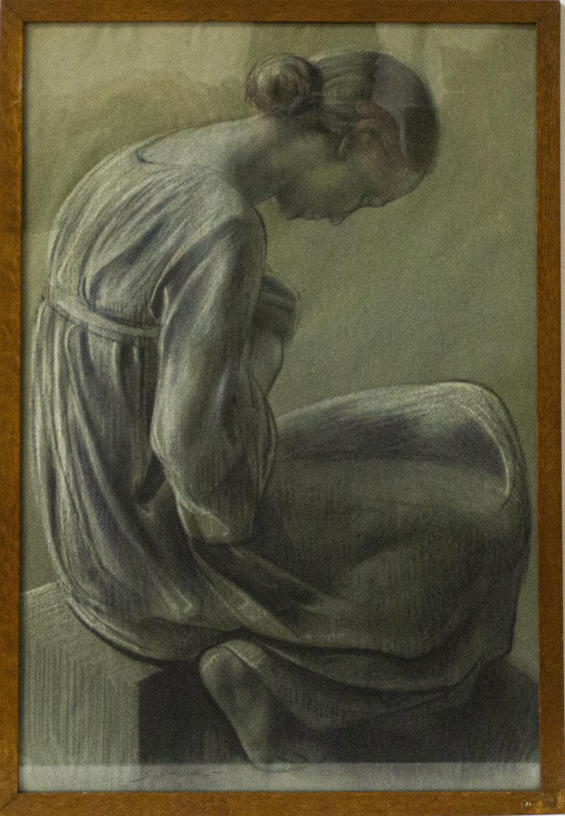 Jeune femme en prière, mine de plomb et réhauts blancs sur papier, signée, 46x30 cm