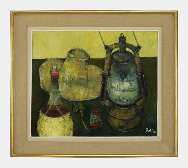 Nature morte à la lampe de tempête, huile sur toile, signée et datée 56, 46x55 cm